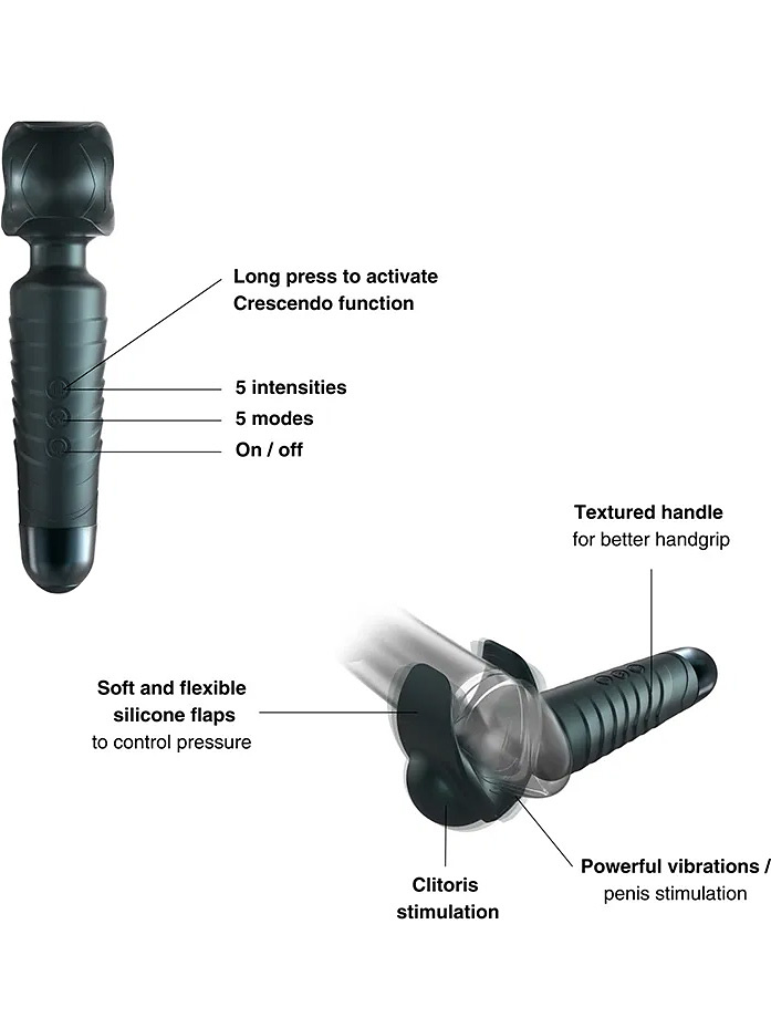 The ManWand Evo has a unique crescendo-function that increases the intensity for an unforgettable sensual experience. By holding down the intensity-button, the vibrations gradually increase in intensity until you release the button. When you release, the sextoy continues to vibrate at the selected intensity. You choose your own rhythm! You can also switch between 5 vibration-modes and 5 intensity-levels.