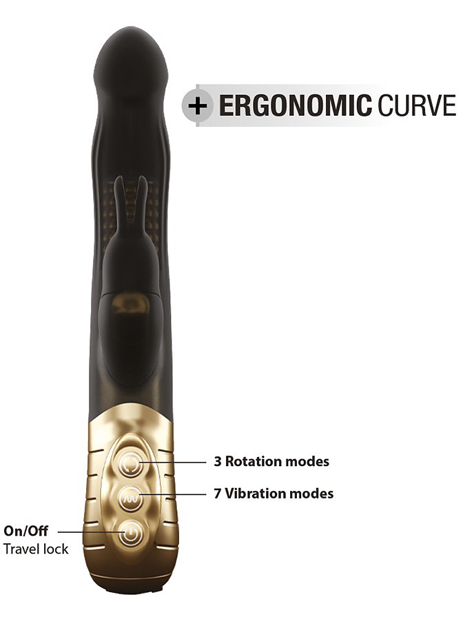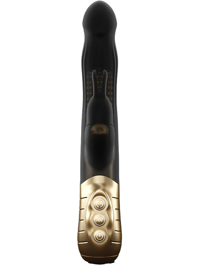 The clitorial vibrator is shaped like a small rabbit whose ears caress and tickles your clitoris very nicely. The rabbit has seven different vibration-modes that allow you to choose the intensity that suits the moment. You can easily control both the vibrations and the rotations with two buttons on the gold-colored part at the bottom.