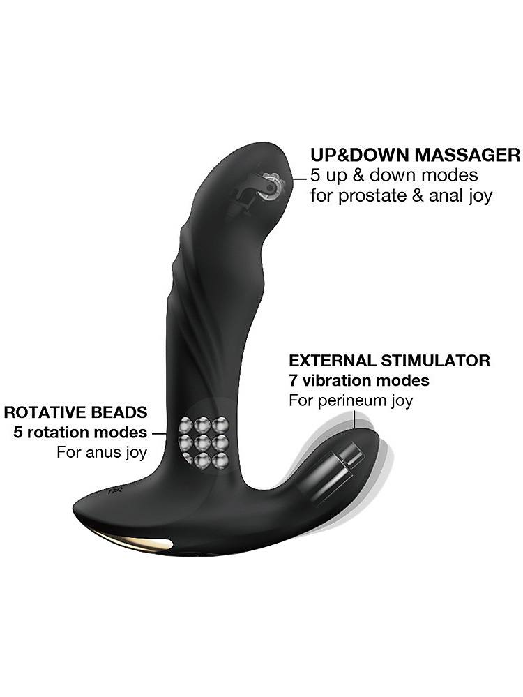 The slightly curved top has massaging up-and-down-movements that provide a pleasant and precise stimulation of the prostate. At the bottom of the shaft are rotating beads that massage the anal wall while the vibrating base stimulates your pelvic floor.