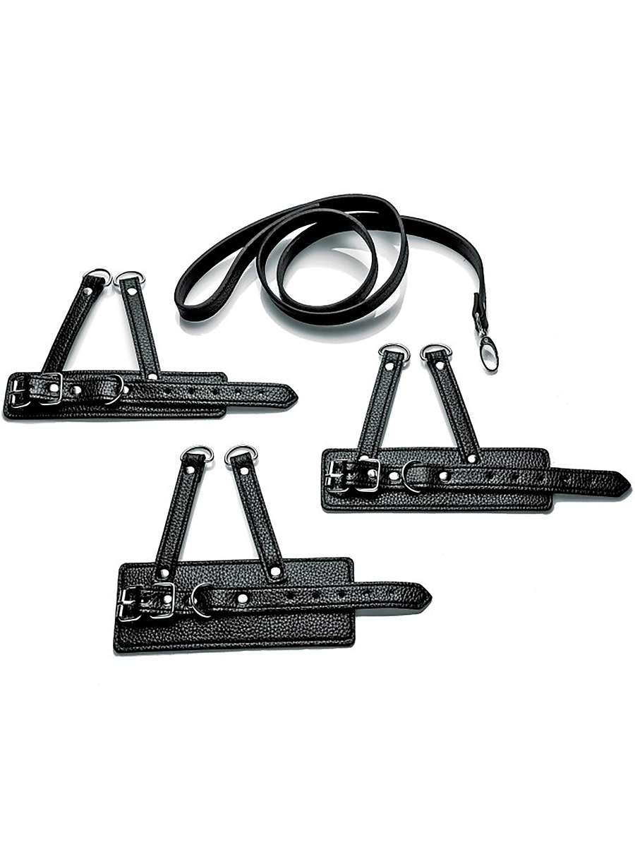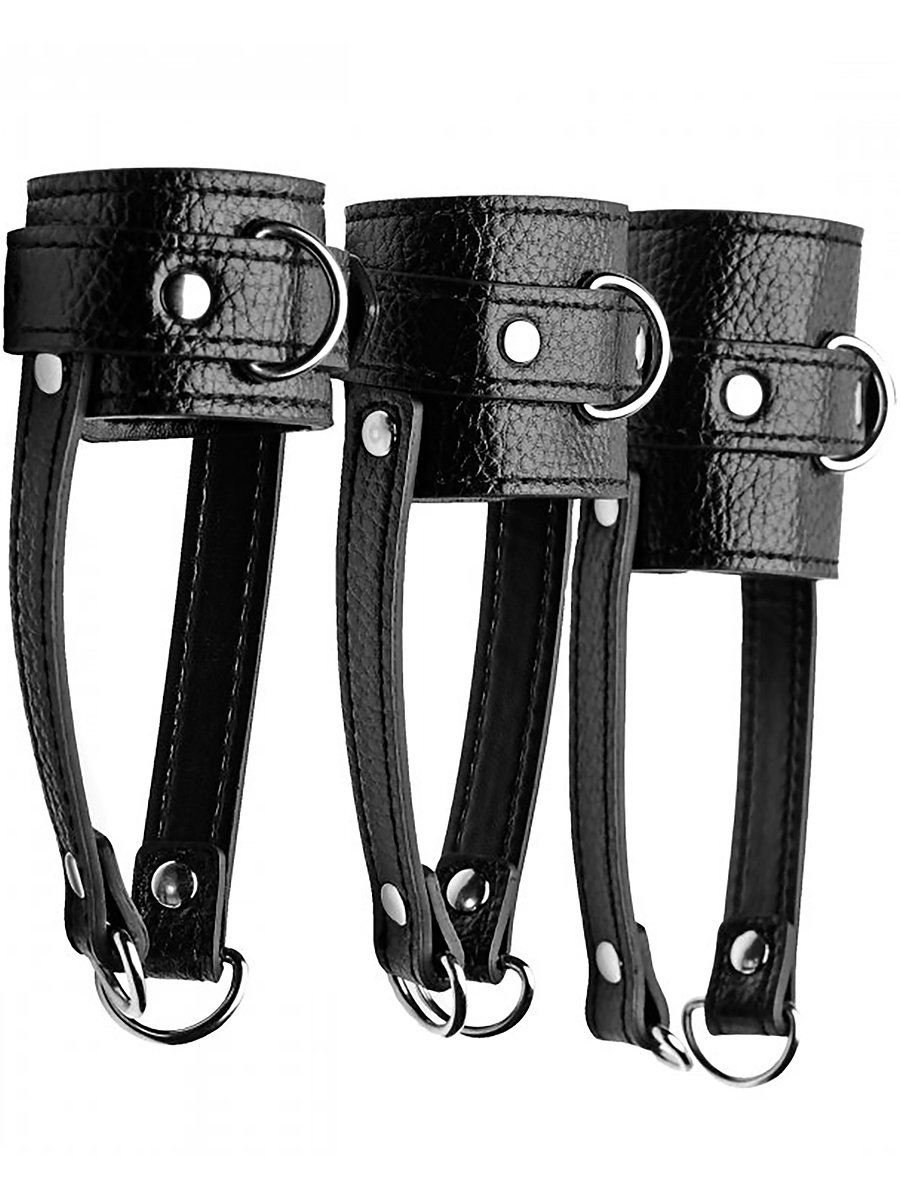 This BDSM kit includes three ball stretchers and a leash to give your domina complete control over you.