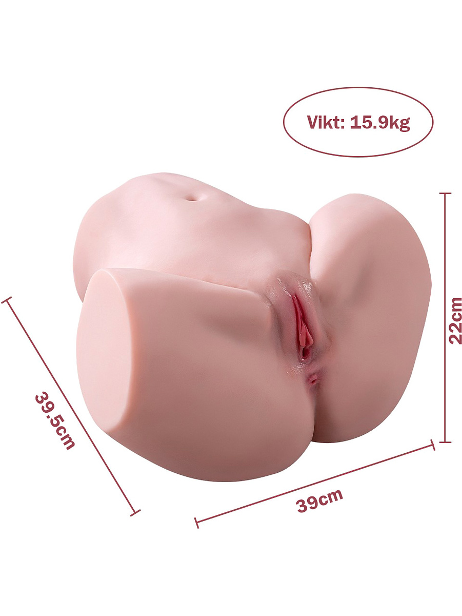 Weighing in at a whopping 15.9 kg and measuring generously (39.5 x 39 x 22 cm), you get a stable, lifelike experience that keeps the doll in place even during more intense sessions. The realistic material is skin-like, soft and supple. The realistic vaginal opening also features a textured canal that increases friction for extra stimulation.