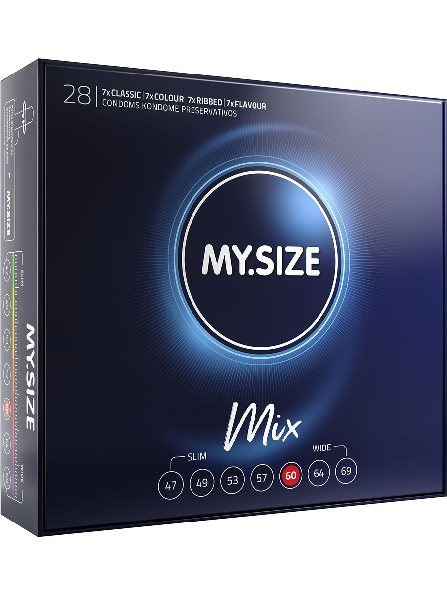 MySize Mix condoms are available in 7 different sizes (different widths). It is the circumference of the penis that determines the recommended width - not the length of the penis. This model is larger than standard size and designed for those who need extra width. It has a nominal width of 6.0 cm and fits you with a penis-circumference of 12 to 13 cm.