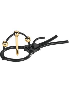 Plunging Pete is a cockring with a penis-plug that has 24 carat gold-plating. Carefully insert the penis-plug into the urethra along with a sterile lubricant. Remember to never pull out the plug immediately after inserting it, let your penis get used to it. The penis ring can be adjusted to fit your size.