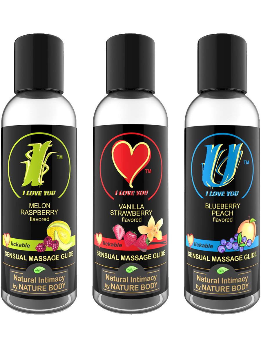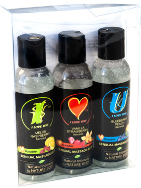 This kit with three different flavour of massage oil will give your sensual massage moments an amazing amount of joy and pleasure. Use the oils for intimate massage and feel how the touch combined with I Love You makes your partner vibrate with pleasure.