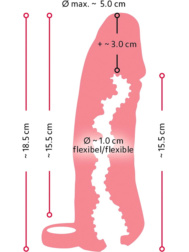 It has a realistic design with a vaginal opening, while the sleeve has a penis look with full glans and pulsating veins. The top is solid and lengthens you by 3 cm if you use it as a penis cover. In addition, your partner will be able to enjoy increased girth.