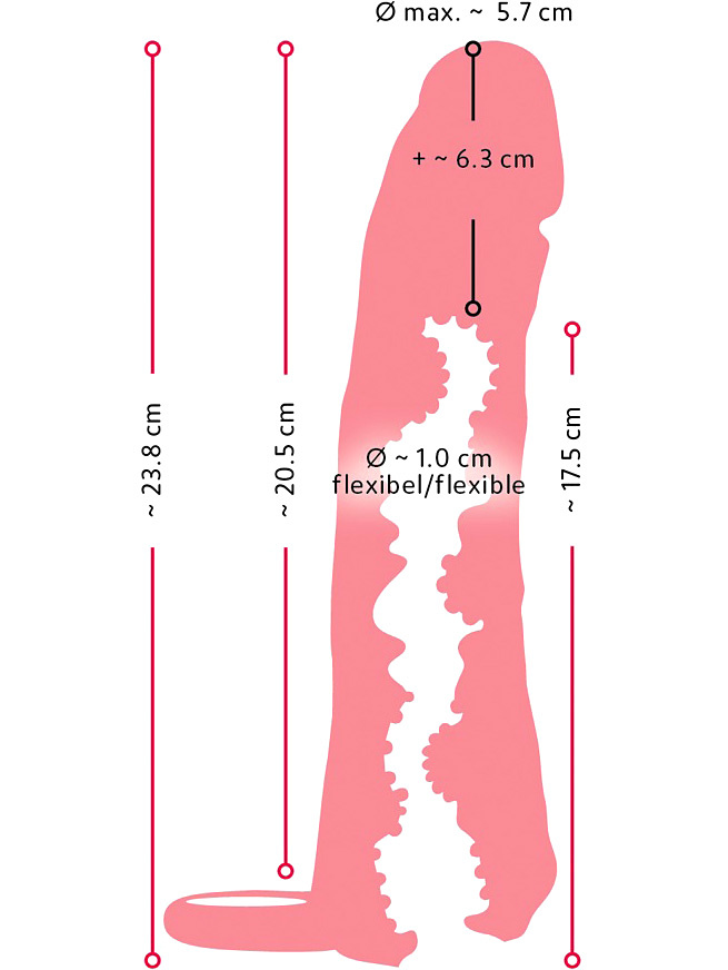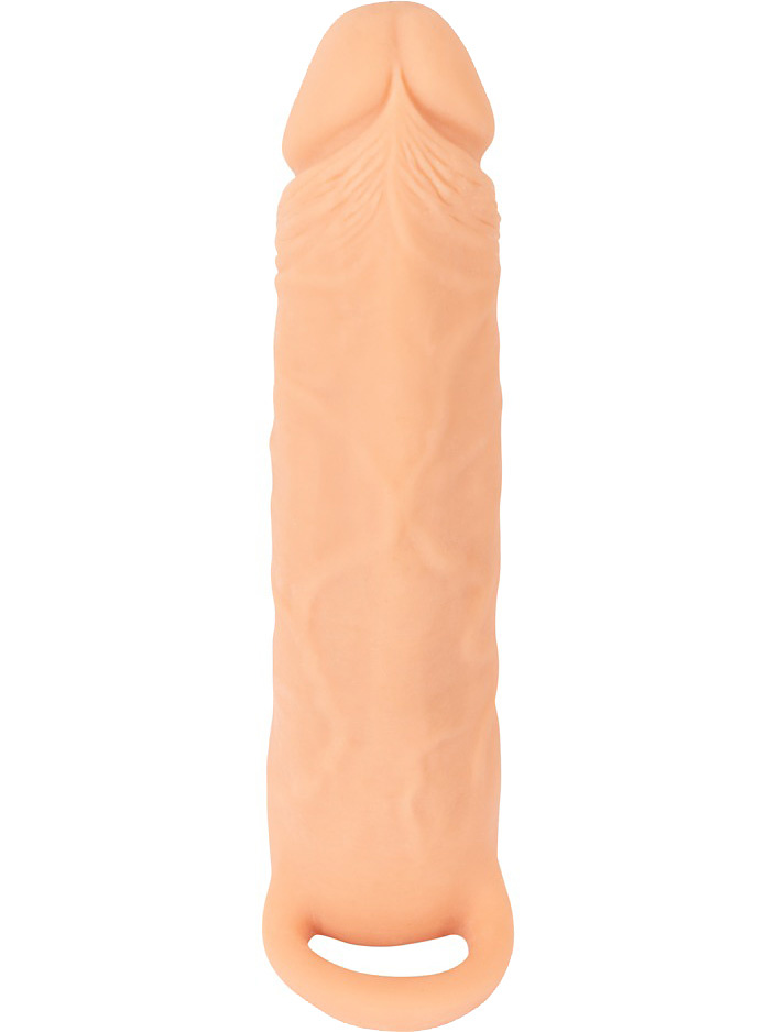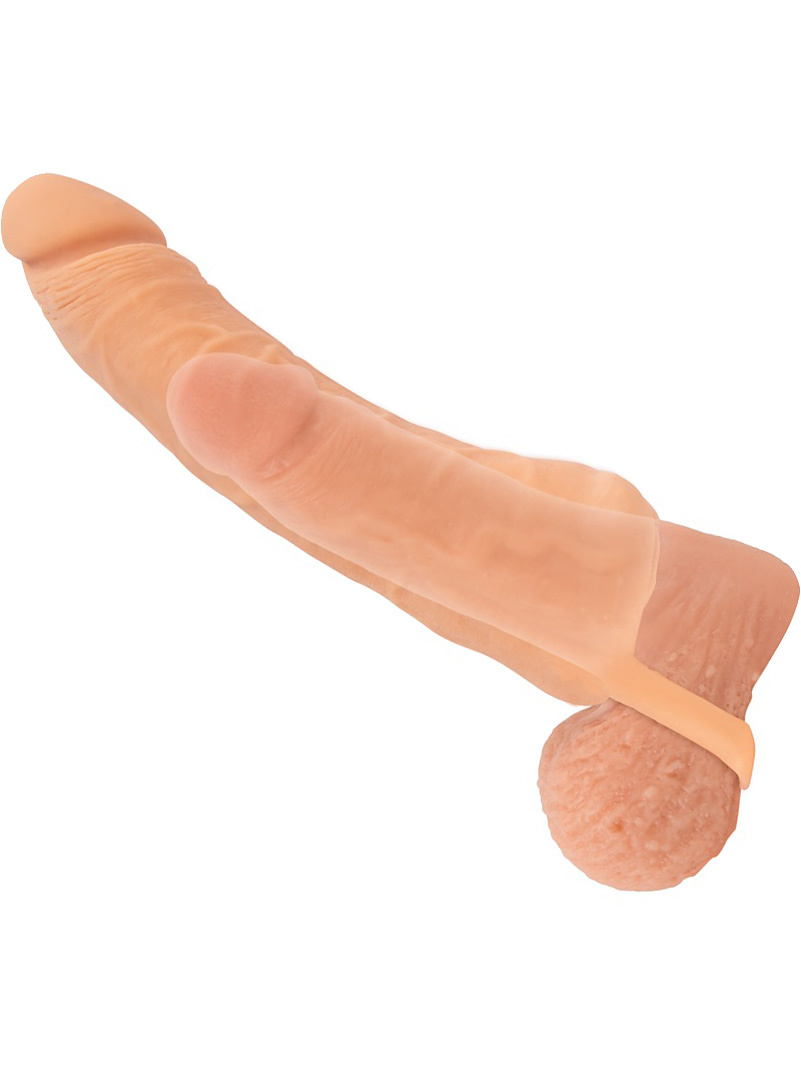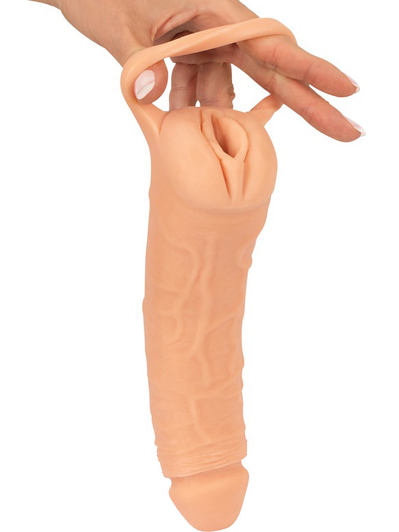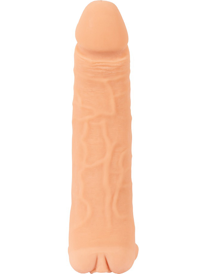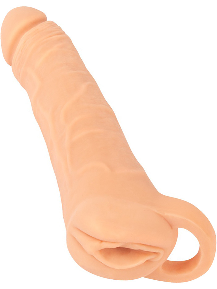 It has a realistic design with a vaginal opening, while the sleeve has a penis look with full glans and pulsating veins. The top is solid and lengthens you by 3 cm if you use it as a penis cover. In addition, your partner will be able to enjoy increased girth.