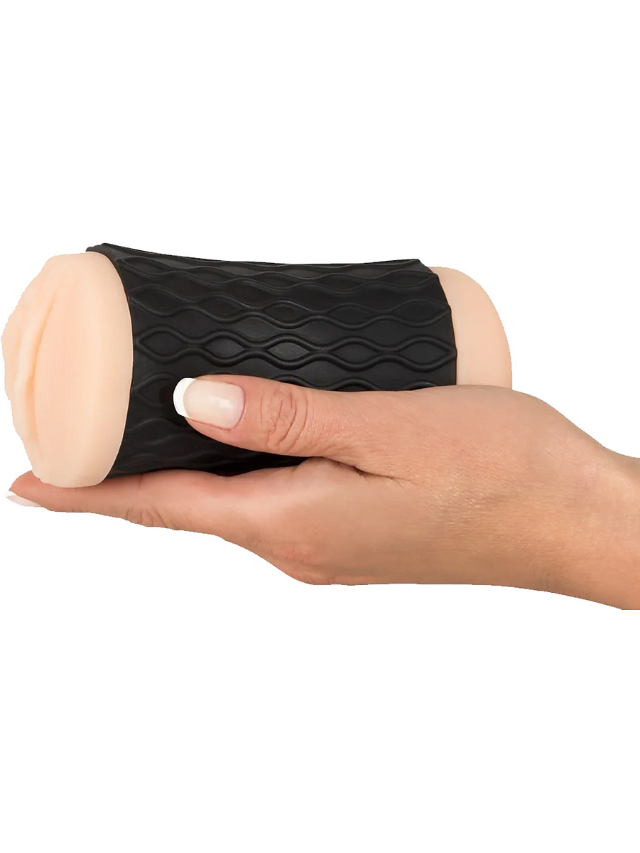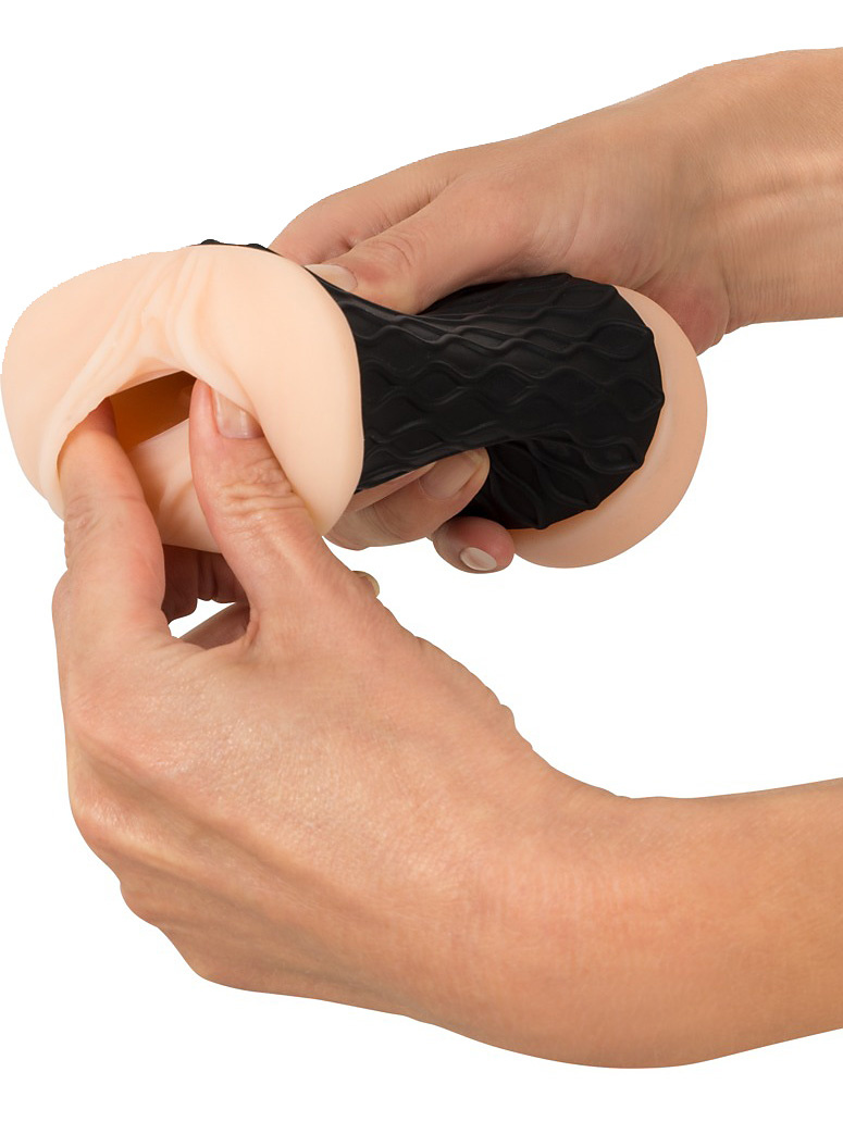 Behind the vaginal opening are hidden stimulating knobs and on the other side behind the anal opening are pleasant grooves. Enjoy a lovely massage as you move it back and forth over your penis, preferably together with water-based lubricant.