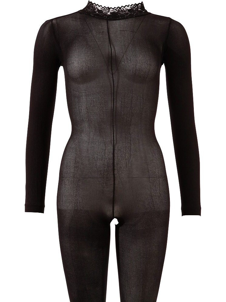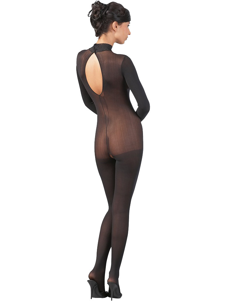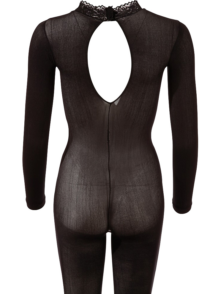 Long-sleeved catsuit with semi-transparent material that sexily shows the skin through. The collar has beautiful lace-patterns and closes at the back with press-studs. At the back across the back there is an oval cutout and between the legs the design is open to leave your most intimate parts bare.