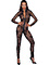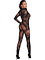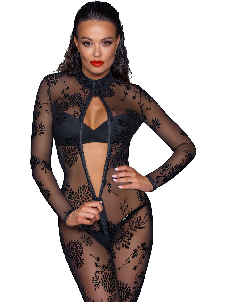 This is a lightweight transparent jumpsuit from Nour Handmade with long sleeves and long legs. It is made of a soft and stretchy powernet that is decorated with beautiful floral patterns in velvet.