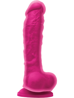 This is a solid and colorful dildo with a realistic design for a real feel. With a well-marked glans and pulsating veins, the penetration is incredibly pleasant. To complete the experience, it has a rough pouch and a suction cup at the bottom that you can attach to flat surfaces. This enables different positions while leaving your hands free for other things.