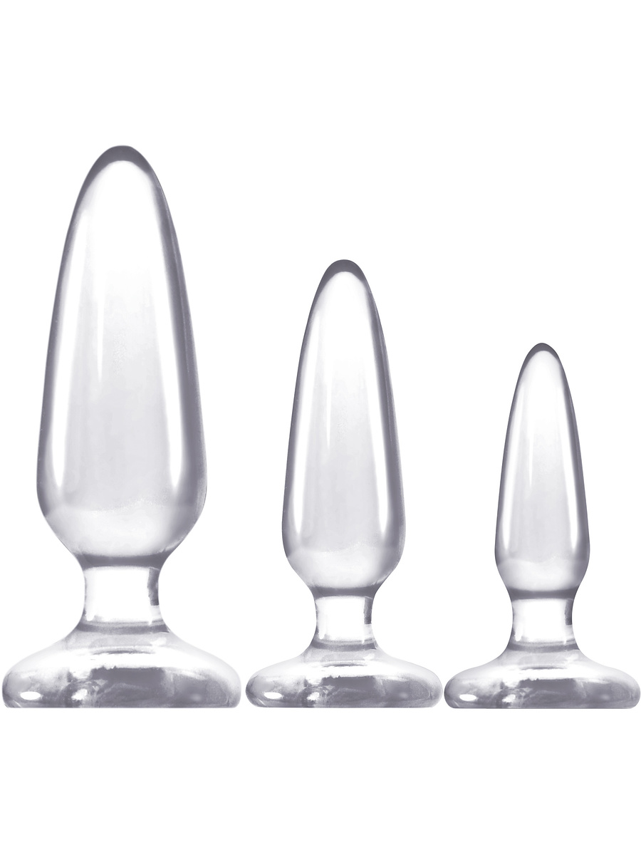 This is a kit of three transparent and classically shaped anal plugs. They all have the same design but vary in size to let you find what suits you, and to let you get used to and try bigger over time.