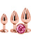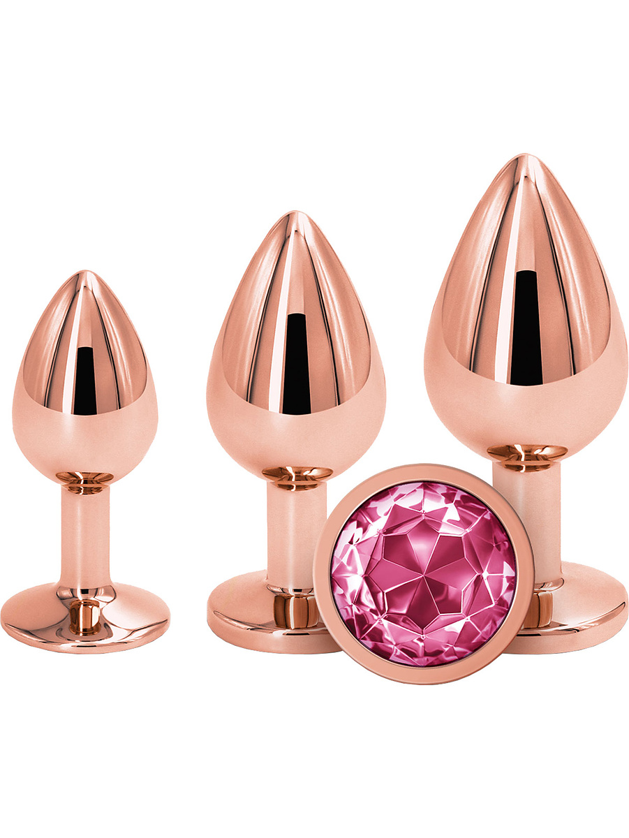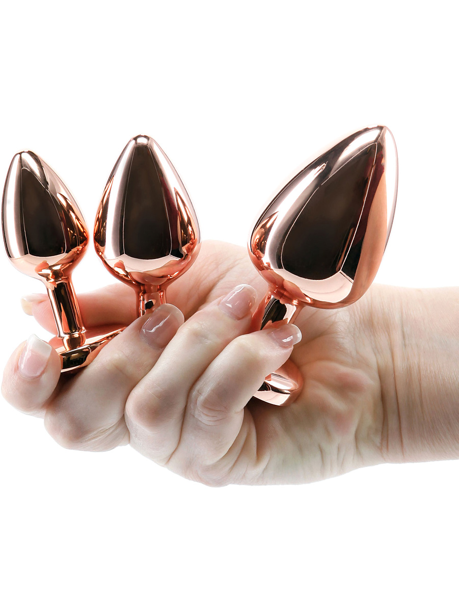 Each butt plug have a delicious rosegold color that matches the pink stone at the bottom. They are made of lightweight aluminum which, together with the tapered top, provides a comfortable entry. The wide and round base prevents them from slipping too far in, while the jewelry sits comfortably between the buttocks.