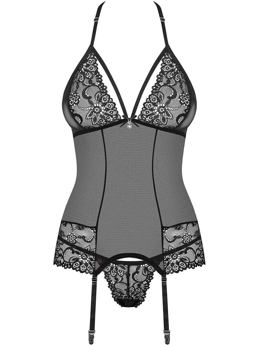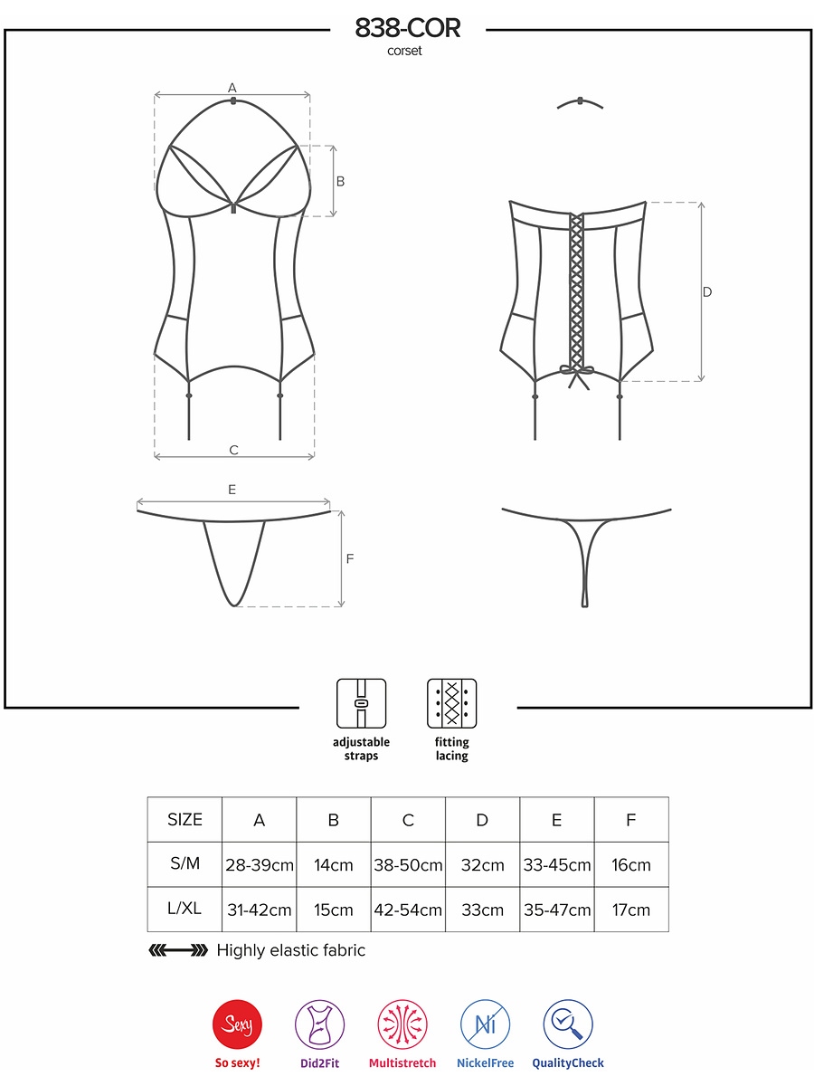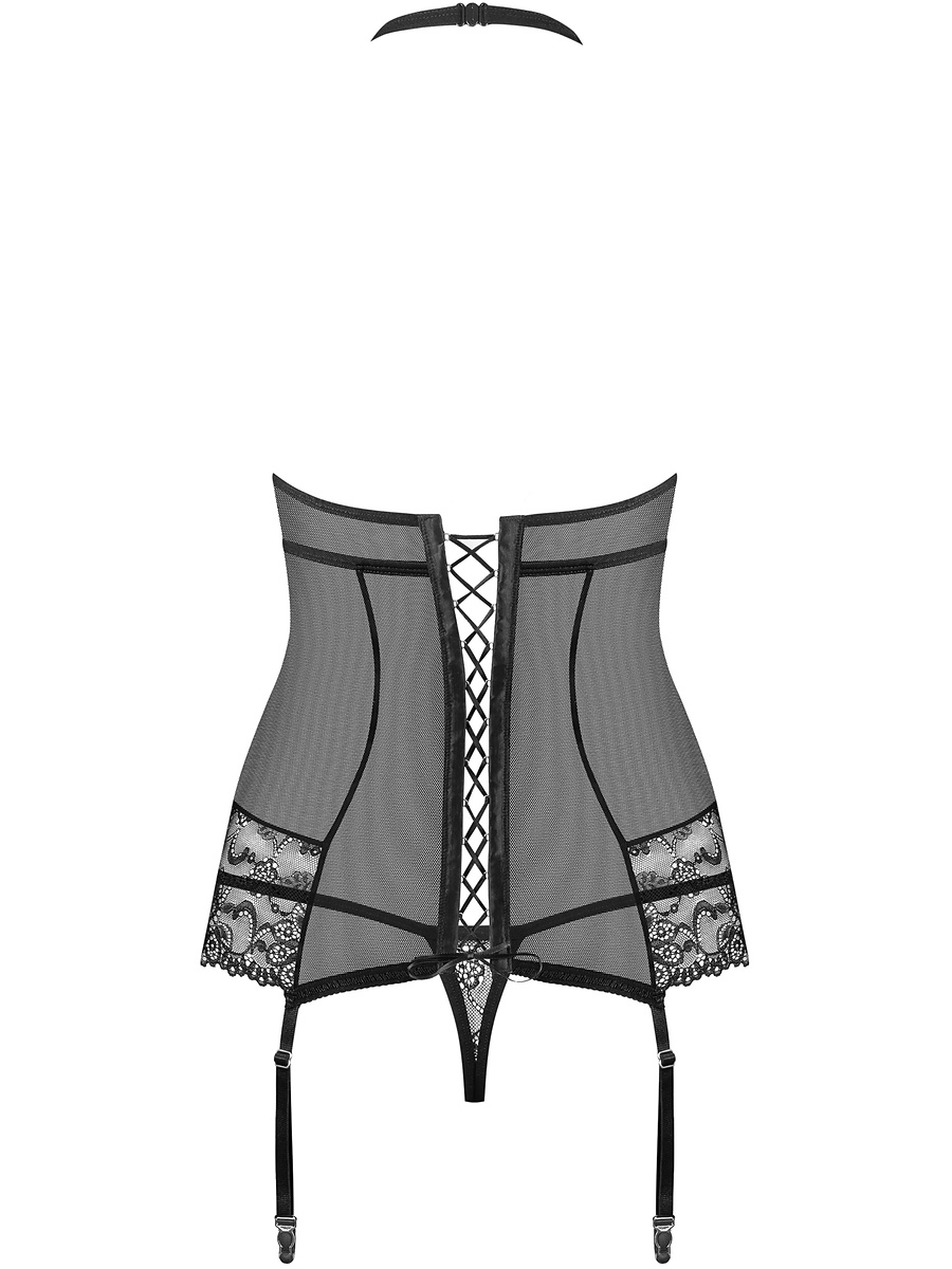 Adjustable straps that go around the neck and the sexy lacing at the back create a perfect fit in combination with the adjustable garter holders, while decorative straps over the breasts and a shiny nickel-free jewel in the front make you irresistible.