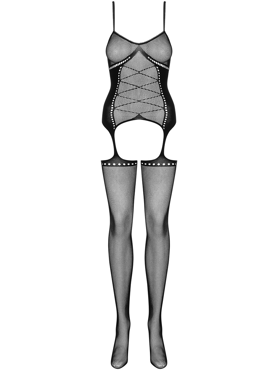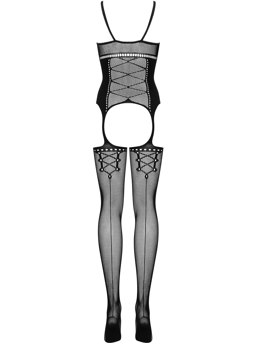 Amazing bodystocking with sexy knitting and a tempting imitation of corset lacing front and back. The special knitting 3SKnit creates a strong cohesion with denser knitting on the sides for a slim waist and beautiful details, the parts are linked with four straps.