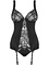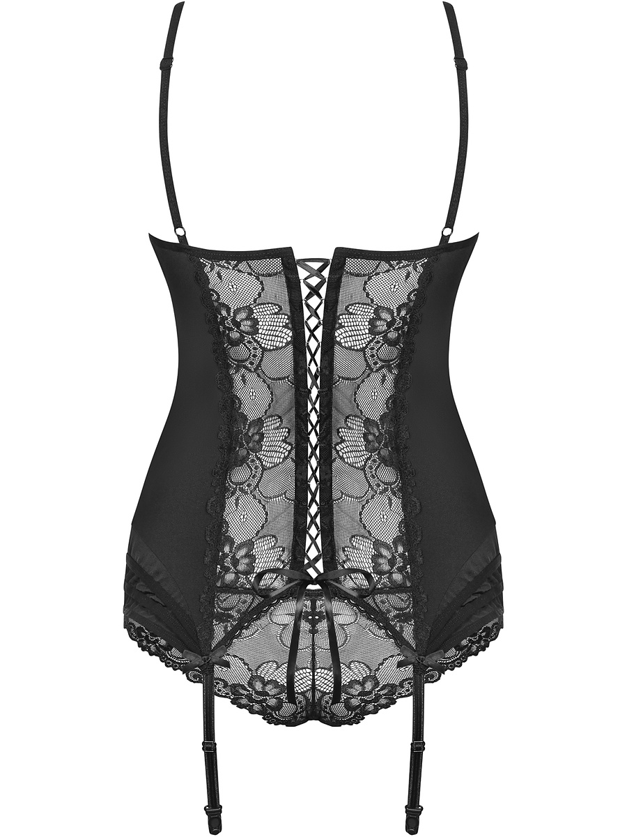 This tempting corset is made in a plain still elastic fabric and lace with a floral motif combined with underwires under the cups that emphasize the breasts make you irresistible, while adjustable shoulder straps and garter holders and the beautiful lacing at the back create the perfect fit.