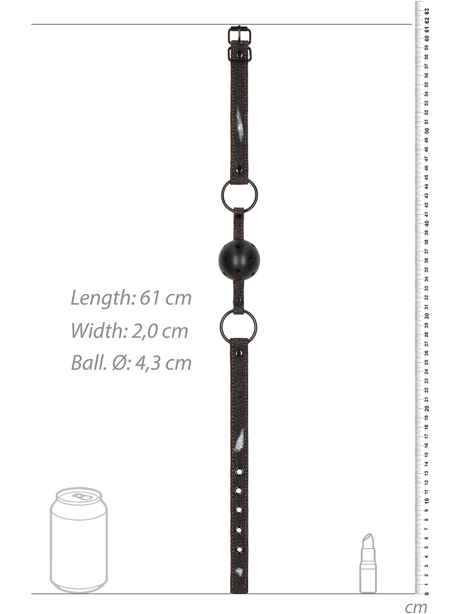 Place the ball in the mouth of your submissive partner and adjust the strap with holes for the best fit. The strap has a nice denim design with rips. The stainless steel o-rings on the side of the ball allow you to attach other bondage accessories for endless possibilities.
