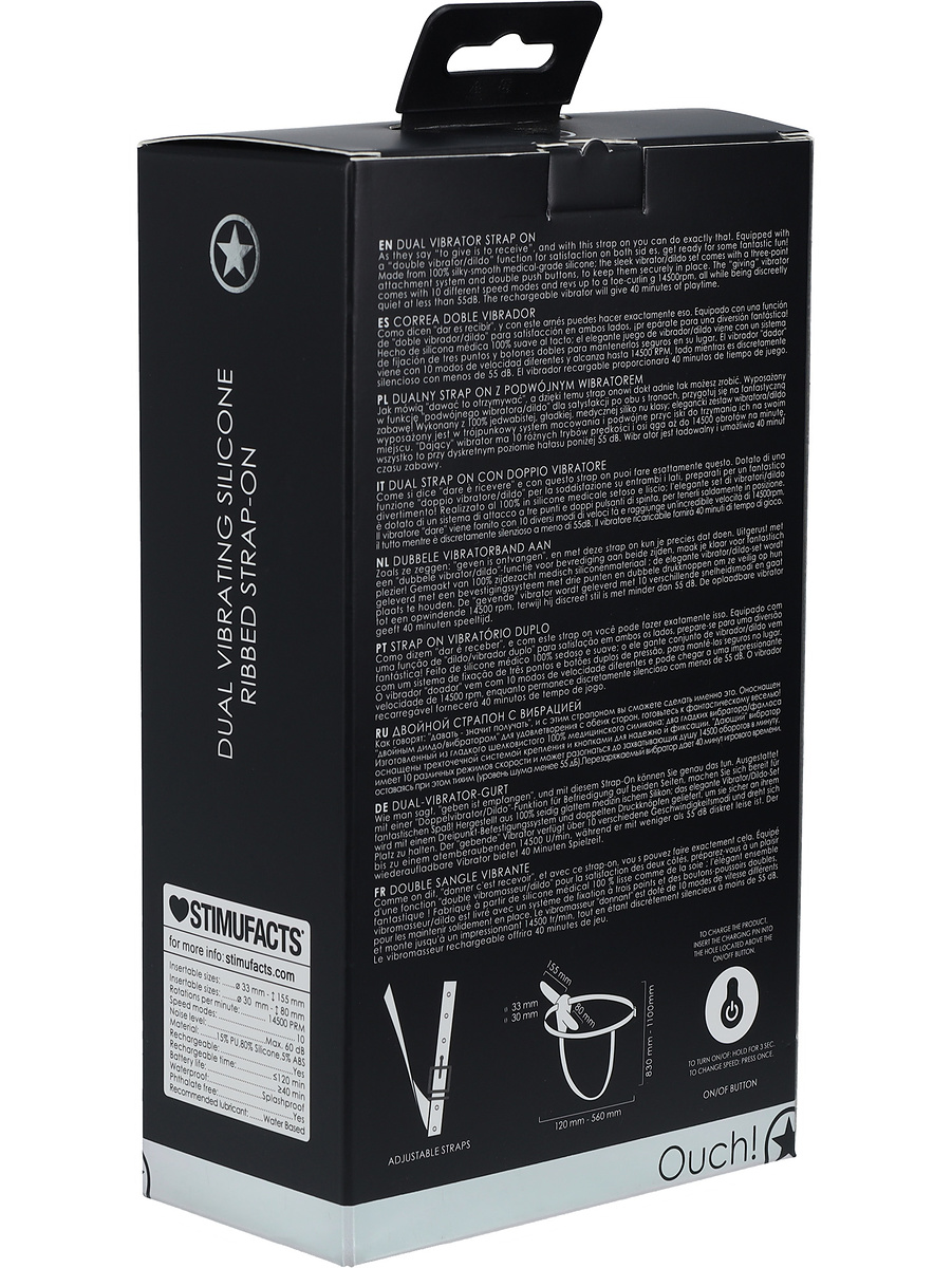 The smaller dildo (8 x 3 cm) is placed vaginally on the wearer while the longer ribbed dildo then penetrates the recipient. Inside the long dildo there is also a vibrator that delivers stimulating vibrations. Choose between 10 exciting vibration-modes. The vibrator is rechargeable via the supplied USB-cable and provides up to 40 minutes of pleasure on one charge.