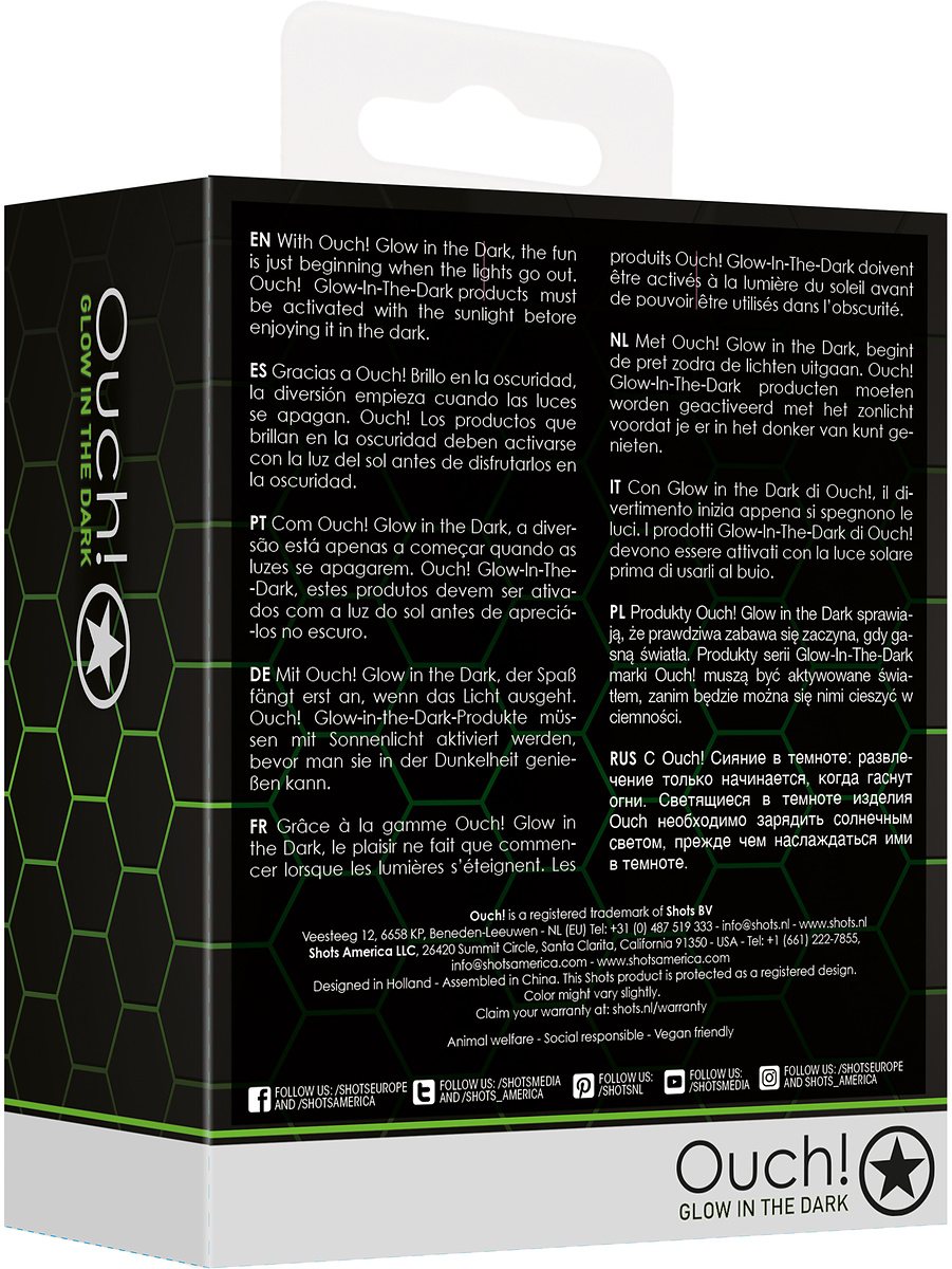 Ouch! Glow in the Dark is a series of luminescent bondage-products and sextoys that glow in the dark. Perfect for extra excitement and playfulness - the fun starts when the lights go out!