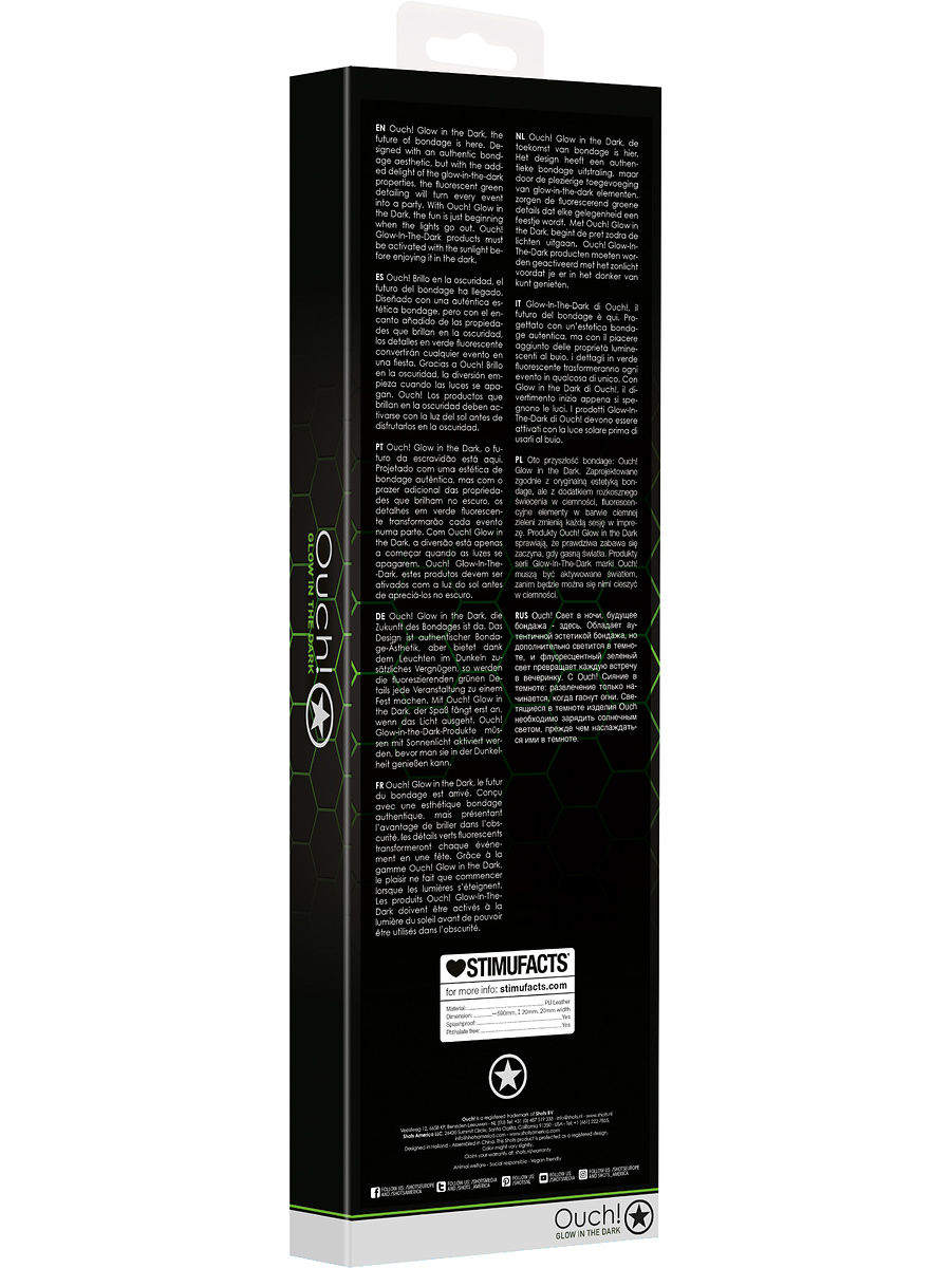 Ouch! Glow in the Dark is a series of luminescent bondage-products and sextoys that glow in the dark. Perfect for extra excitement and playfulness - the fun starts when the lights go out!