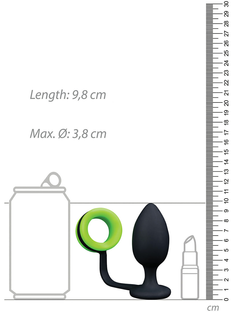 With this sex toy you get the opportunity to double your pleasure. The cockring gives you a stronger and longer-lasting erection while it glows deliciously in the dark. The anal plug will also give you a nice anal-stimulation with its egg-shaped design.