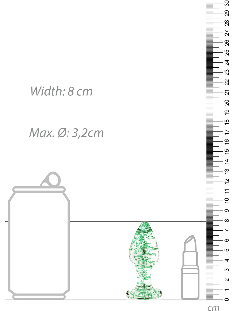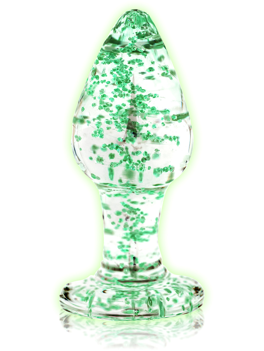 Are you looking for orgasmic anal stimulation? This glow in the dark butt plug will not disappoint you. The butt plug is made of glass with green, glow-in-the-dark glitter on the inside for extra excitement. The design has a tapered top for a comfortable entry and the narrow neck means it sits comfortably in place. At the bottom there is a wide base that prevents the plug from slipping in too far.