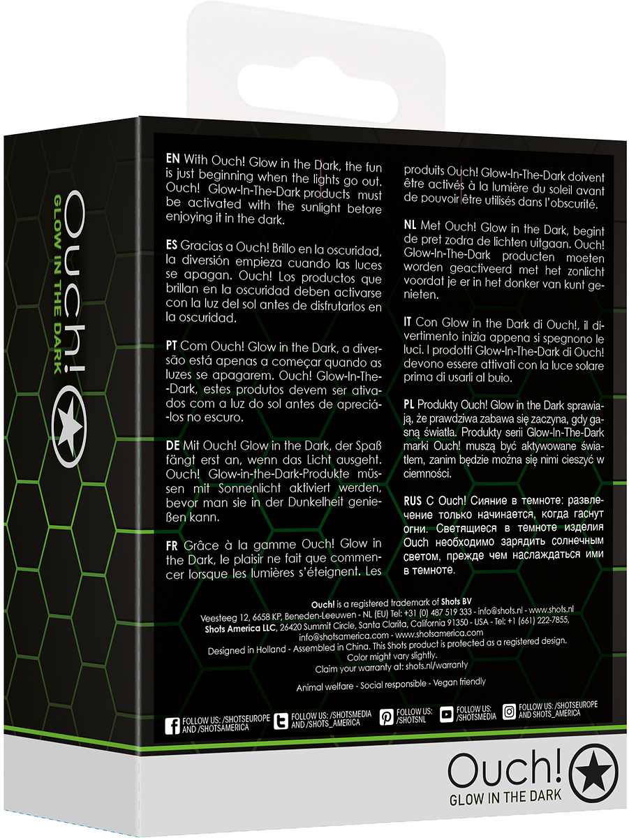 Ouch! Glow in the Dark is a series of luminescent bondage-products and sextoys that glow in the dark. Perfect for extra excitement and playfulness - the fun starts when the lights go out!