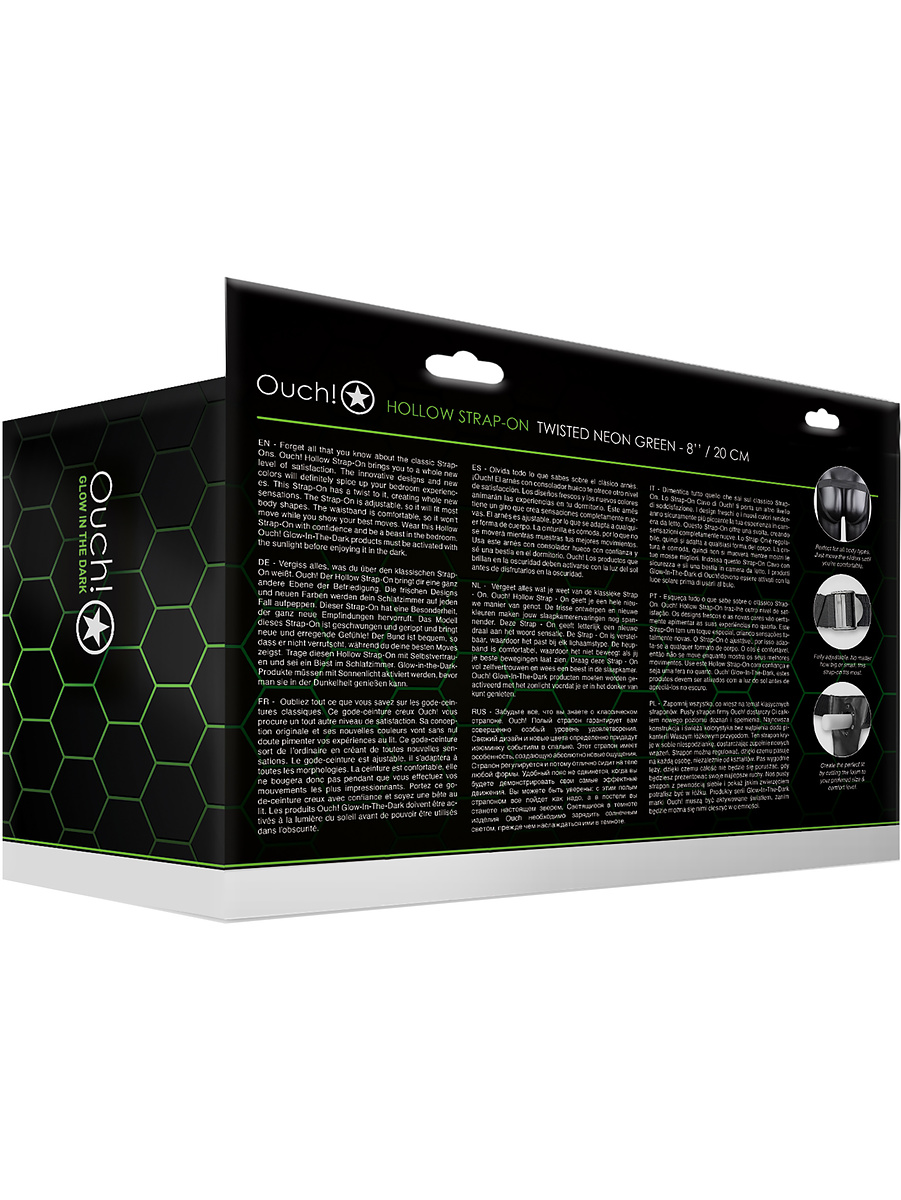 Ouch! Glow in the Dark Ribbed Hollow Strap-On with Balls, 21 cm