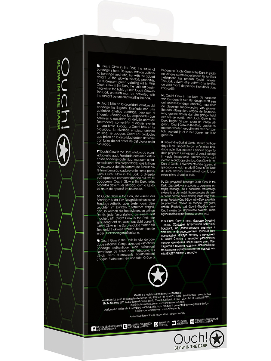 Ouch! Glow in the Dark is a series of luminescent bondage-products and sextoys that glow in the dark. Perfect for extra excitement and playfulness - the fun starts when the lights go out!