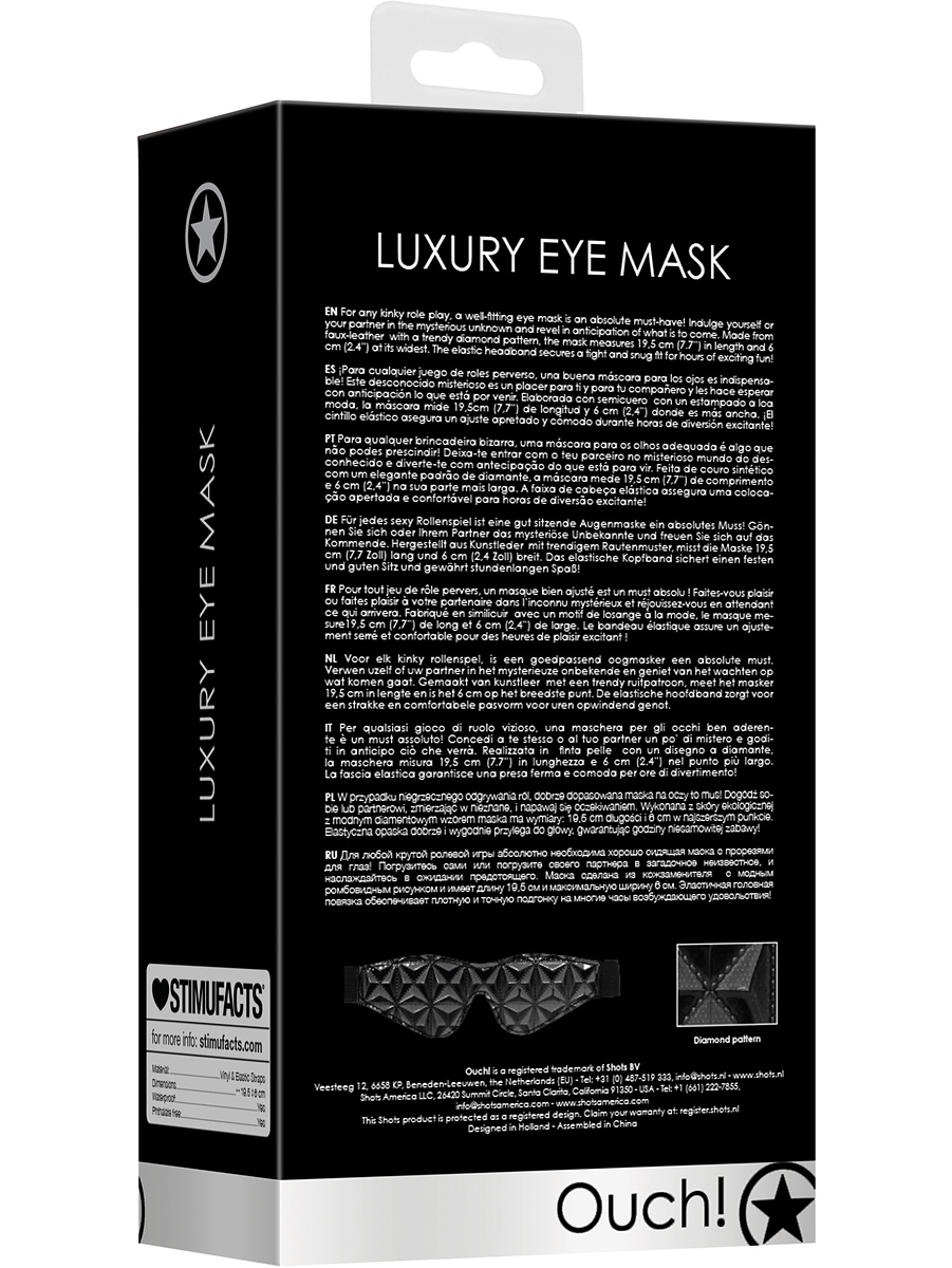 This luxurious blindfold is made of faux leather with a trendy diamond pattern. The elastic band that goes around the head ensures that the blindfold stays securely and comfortably in place.