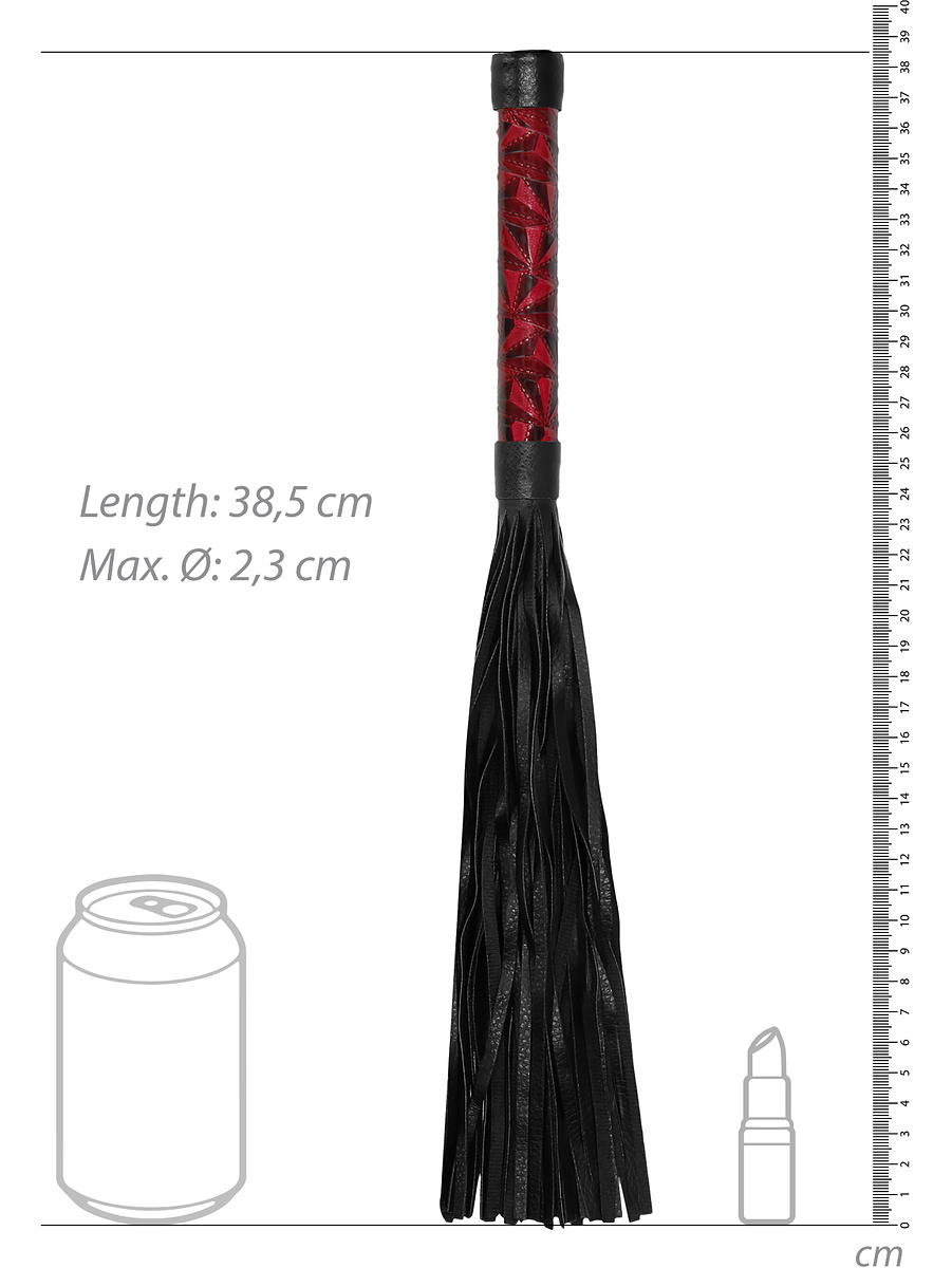 The flogger is a total of 38.5 cm long with a robust handle of 14.5 cm. The lashes are 24 cm long and tear intensely on your partner's bare skin.