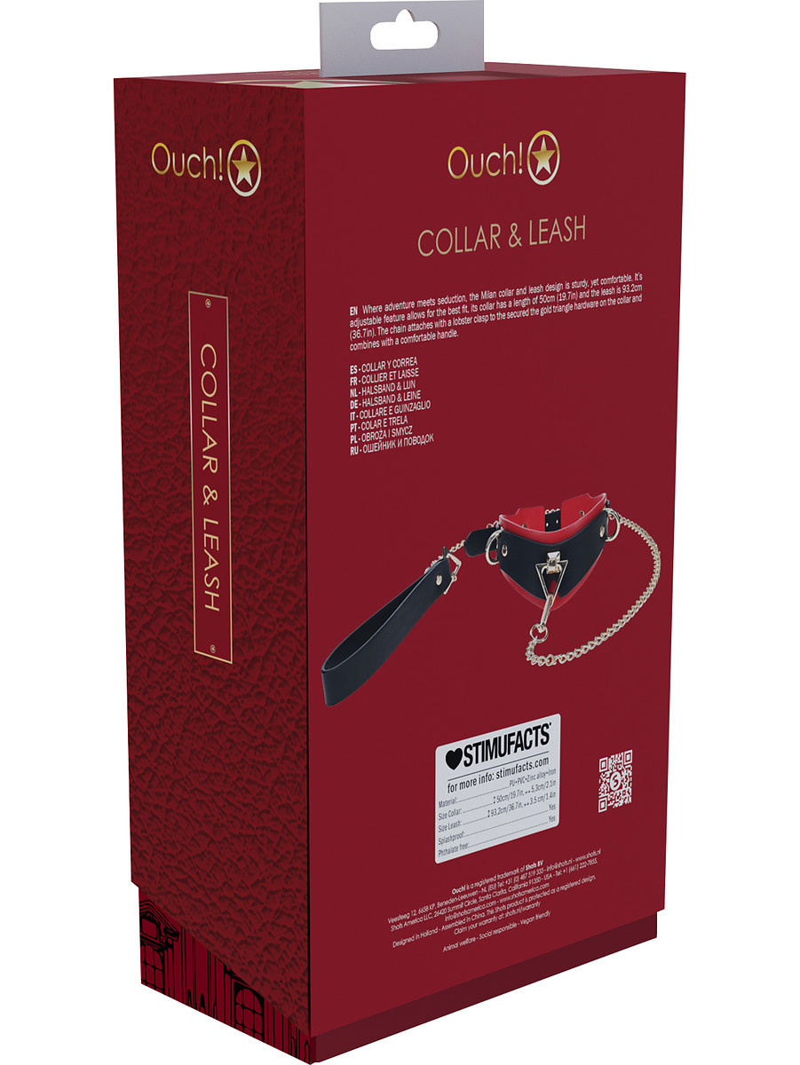 This collar and matching leash are made from durable PU-leather in bold red and black. It sits comfortably against the skin but provides a firm grip for more controlled play. Gold-tone metal-details and chain add exclusivity and contrast to the expressive design.