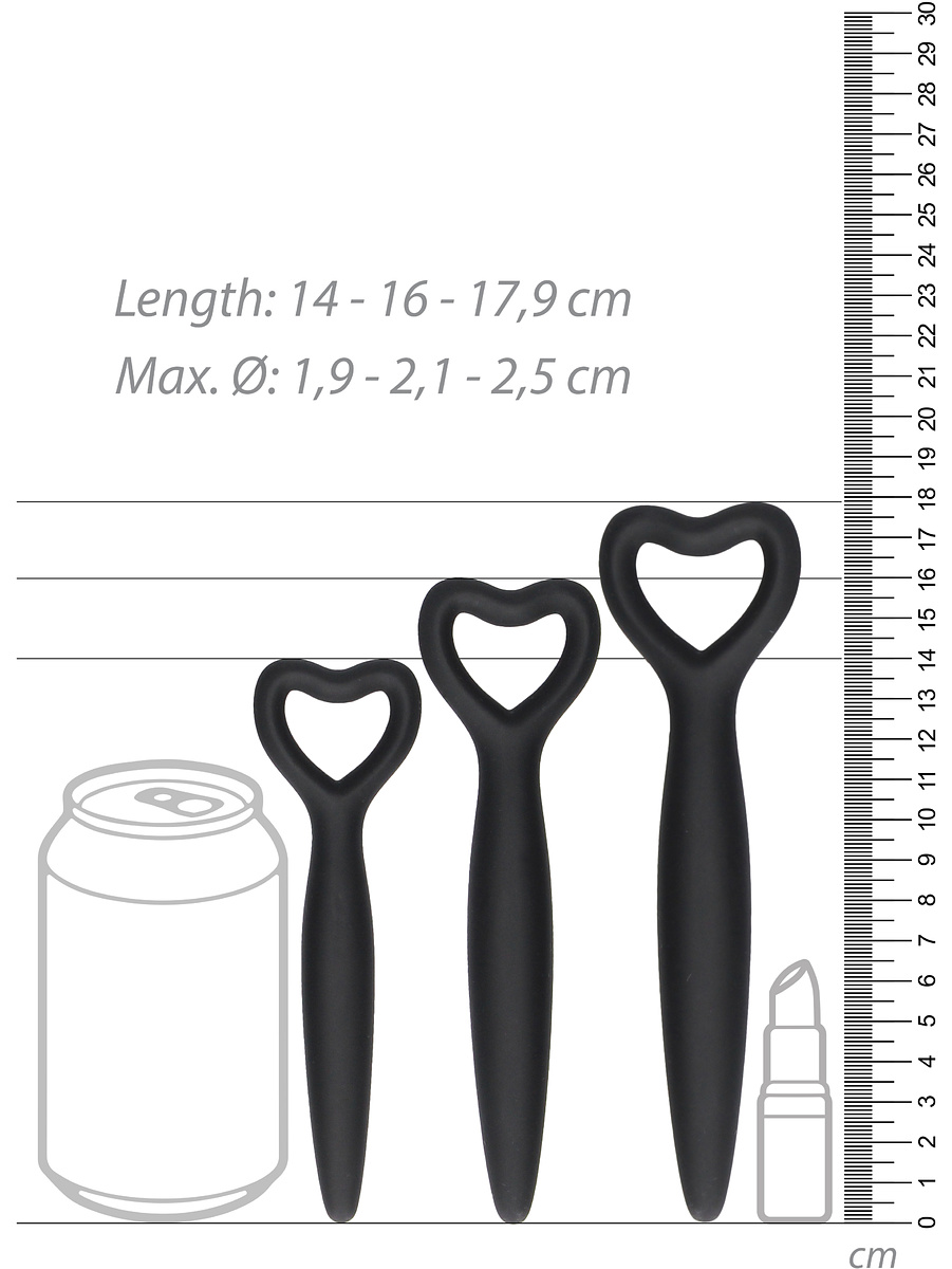 This is a set of five vaginal dilators in different sizes so you can gradually accustom your vagina to penetration. The smallest has a diameter of 1,1 cm and the largest a diameter of 2,5 cm. They are made of silky-smooth silicone for a comfortable insertion and have a heart-shaped handle that gives you full control over the dilator.