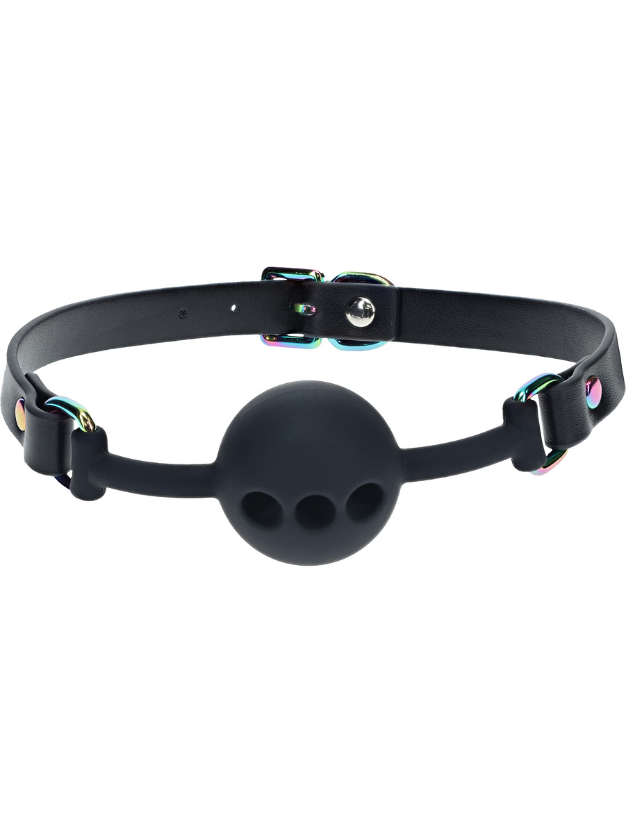 This Gag Ball features a silicone ball with three holes that allows for easy breathing, even during longer sessions. An adjustable strap in high-quality PU-leather makes it comfortable to wear and fits most head-sizes. The shimmering metal-details give it an exclusive and seductive expression that matches the rest of the Venice collection.