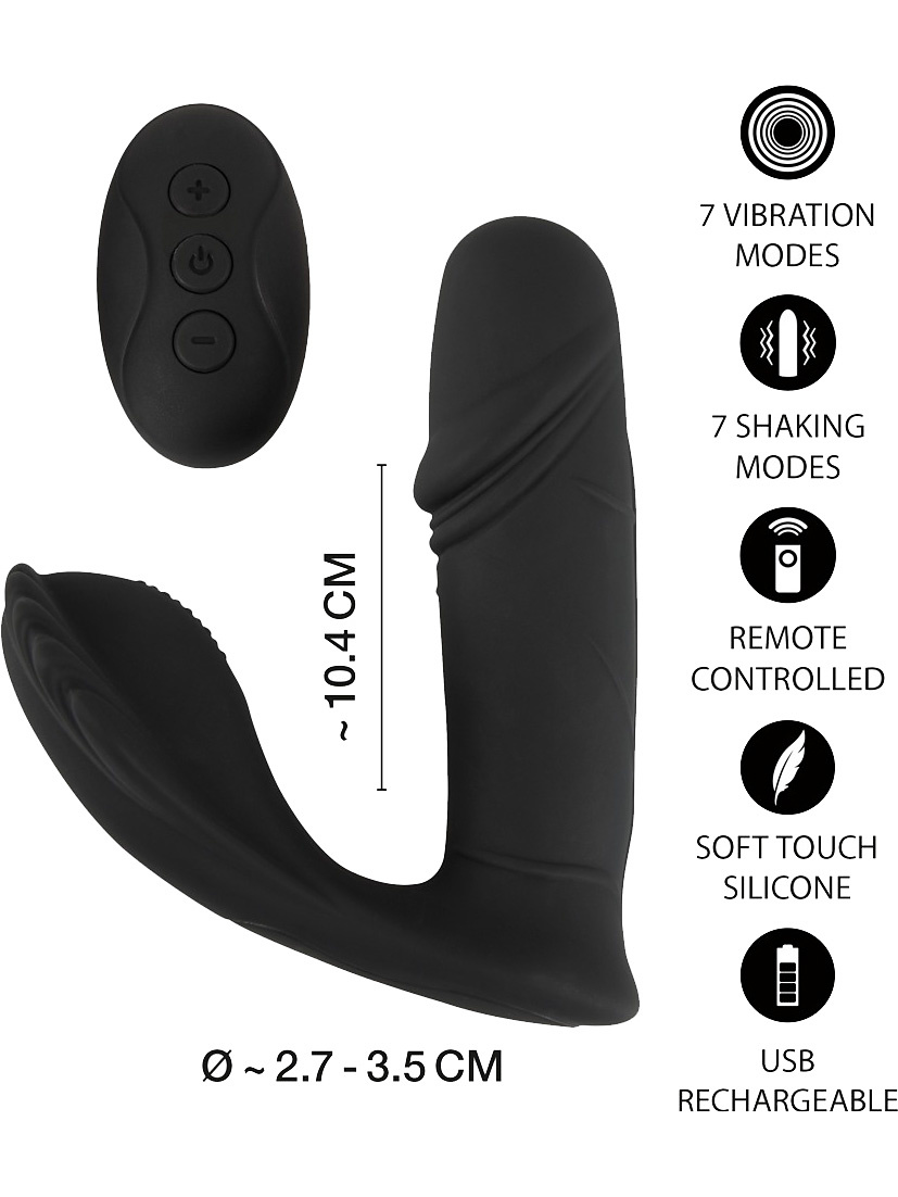Via the wireless remote, you can choose between 7 shaking modes and as many vibration-modes. Control the functions separately using the buttons for a customized experience. The remote has a range of up to 10 meters which allows you to let your partner be in control of your pleasure.