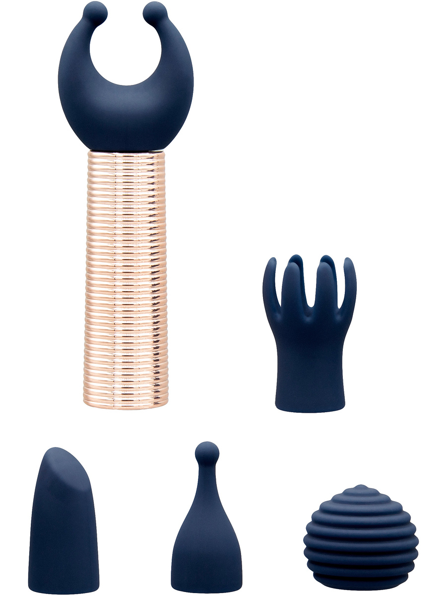 The vibrator has 5 replaceable silicone-heads, each with its own unique shape and feel: