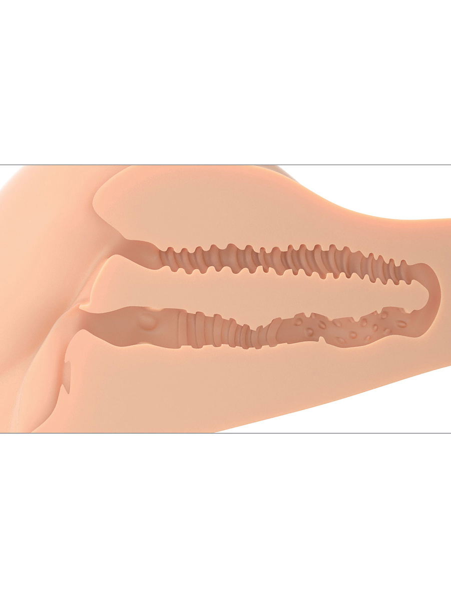 ATTENTION! Both holes connect to the same inner channel which is about 25 cm long. The tunnel walls are meant to be tight and stretchy and aren't very wide when you first start. With a few uses, the elasticity will increase to accommodate most sizes.