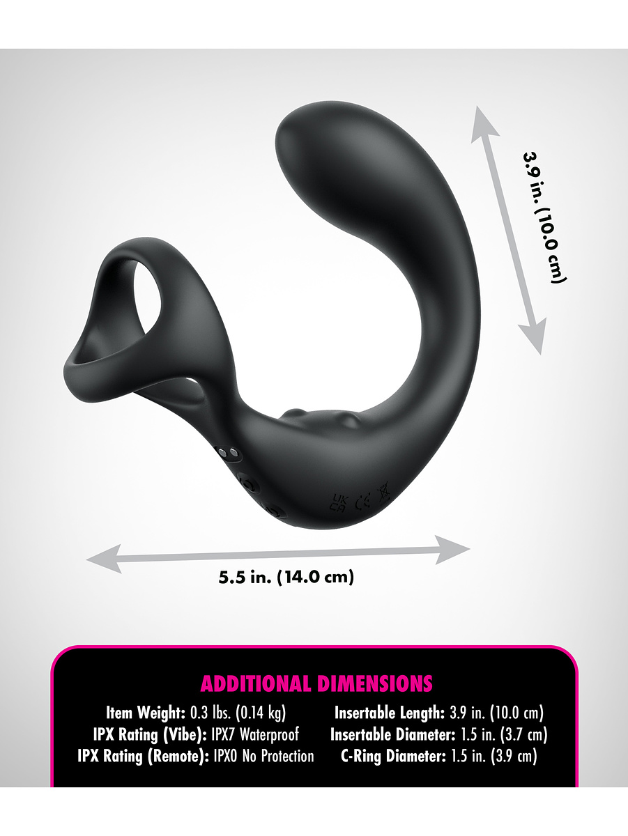 Use the buttons on the base or the wireless remote for an intense handsfree experience, solo or with your partner. The Ass-Gasm Taint-Alizer is also waterproof (IPX7) for play in the shower and bath. Please note that the remote is not waterproof.