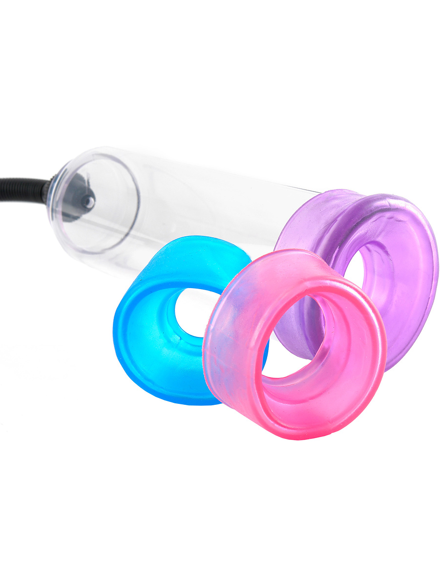 This fantastic training-system is perfect for beginners and includes three soft and flexible TPR-sleeves that gradually increase in diameter (2.5, 3.2 and 3.8 cm). Start with the narrowest sleeve opening and work your way up to the larger one. Each sleeve forms a perfect tightness around your penis to create a powerful vacuum inside the cylinder to in turn cause your erection to rapidly increase in length and thickness.