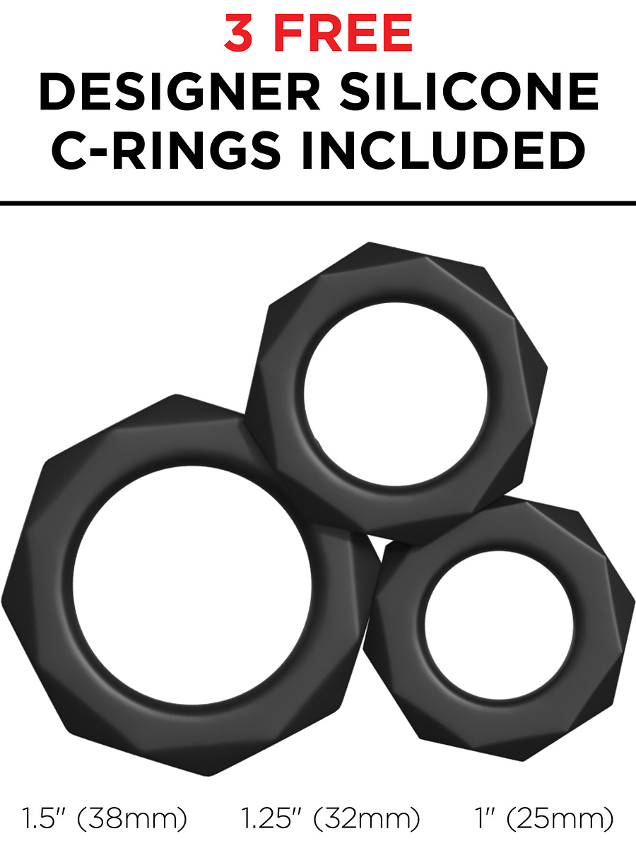 In addition to headphones and USB-cable, three different sized penis rings in comfortable silicone are also included.