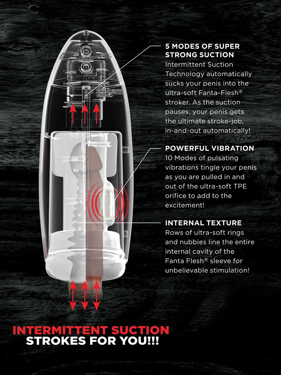 With a rhythmic suction-technology that sucks and pauses every second, the feeling is unbeatable. When the suction effect starts, your penis will slide into the opening and the ultra-soft TPE-sleeve. When the suction is combined with pauses, a pleasant stroking occurs that automatically moves your penis out and in. The strong motors allow you to choose between 5 satisfying suction-modes.