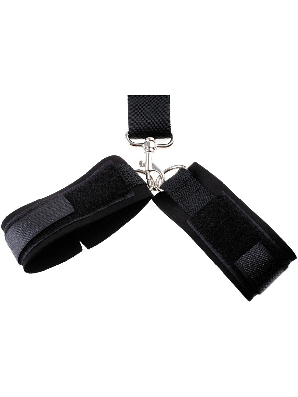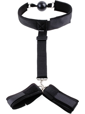 The shackles are attached with velcro and the back-strap can be adjusted to change the position of the wrists. The gag ball is made of bodyfriendly PVC-material. This kit is perfect for the beginner who wants to try BDSM-games but also tough enough for the most experienced!