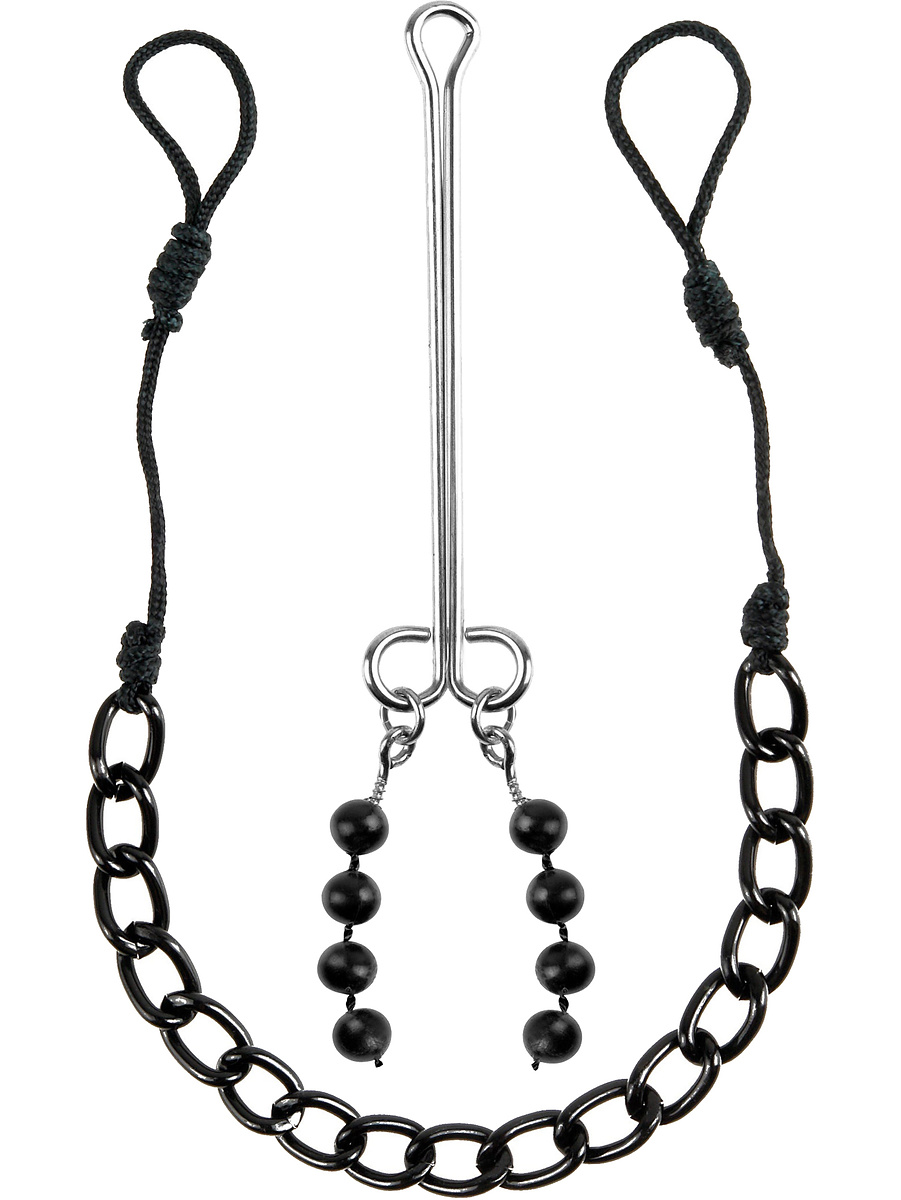 The clit ornament is applied by gently separating the metal prongs and placing the clitoris between them. It provides a light pressure while the beads tease the outer labia, creating an even more intense experience.