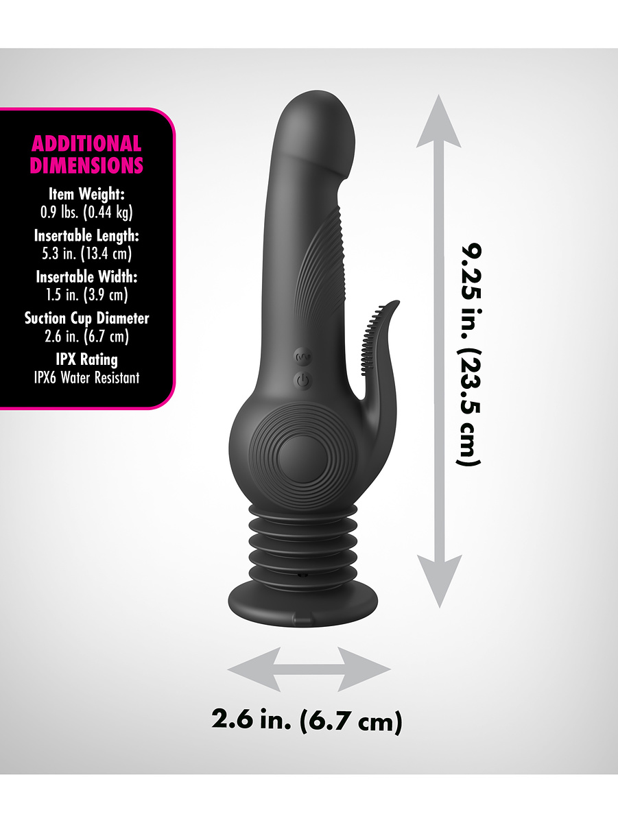 The Pogo Thruster is a revolutionary vibrator that lets you experience the wildest ride of your life. Its internal motor delivers 3 speeds of powerful vibrations, pulsations and rotating movements. The sensation is intensified by a spring-loaded suction cup base that delivers rhythmic and dynamic bouncing movements similar to penetration. As if that were not enough, the knobby tongue and tip of the shaft stimulate with 10 exciting vibration-modes.