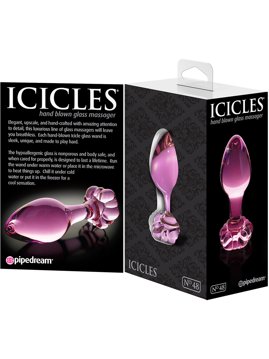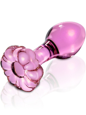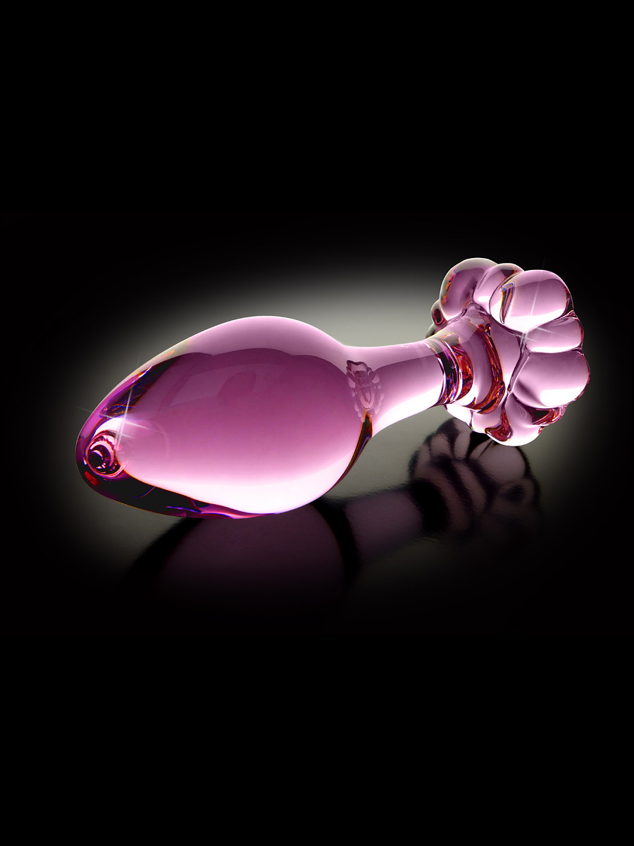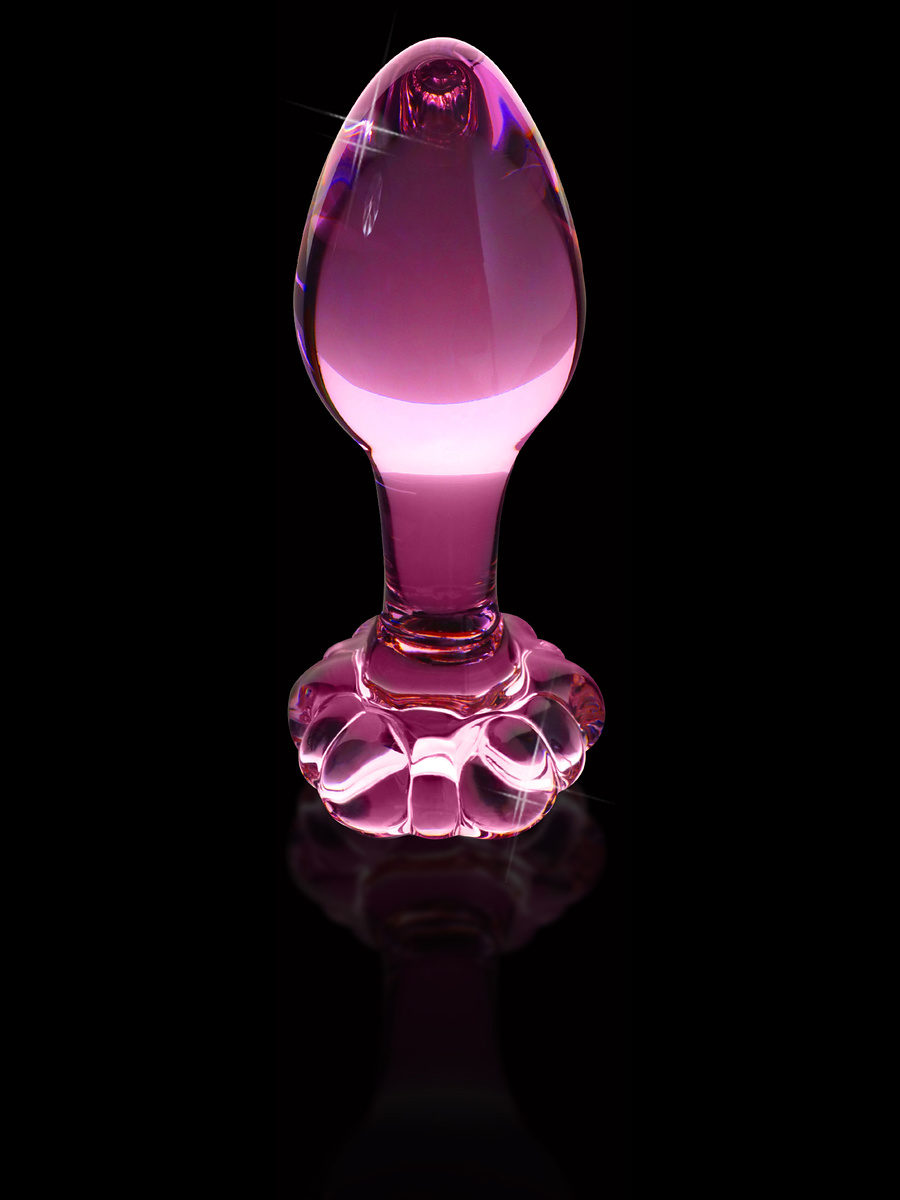 An elegant butt plug made of high-quality and transparent pink glass. At the top, it has a traditional egg-shape that stimulates you nicely and facilitates penetration. At the bottom it becomes narrower and then spreads out quickly to form a beautifully shaped base like a flower. The base prevents it from slipping in too far and also gives you full control over the anal plug.