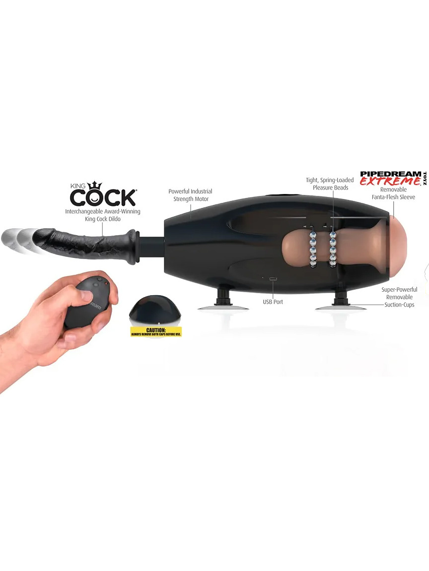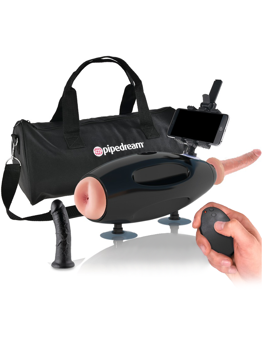 The sex machine contains products from the two award-winning brands King Cock and Pipedream Extreme. Two very realistic dildos and a loose vagina in the realistic material Fanta Flesh. Also included is a mobile holder that can be attached to the sex machine when you want to enjoy solo.