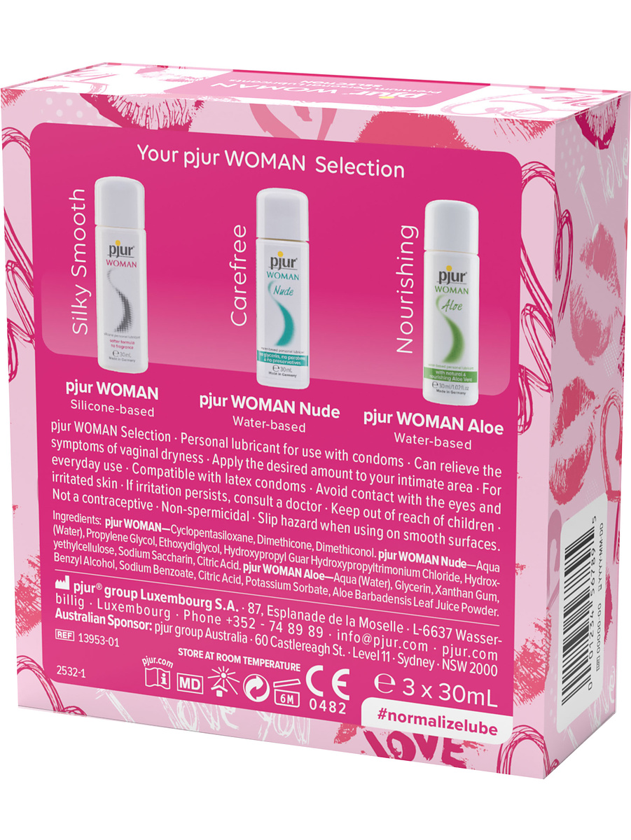 Pjur Woman Selection contains three best-selling water- and silicone-based lubricants: Pjur Woman, Pjur Woman Nude and Pjur Woman Aloe. Each bottle contains 30 ml of lubricant.