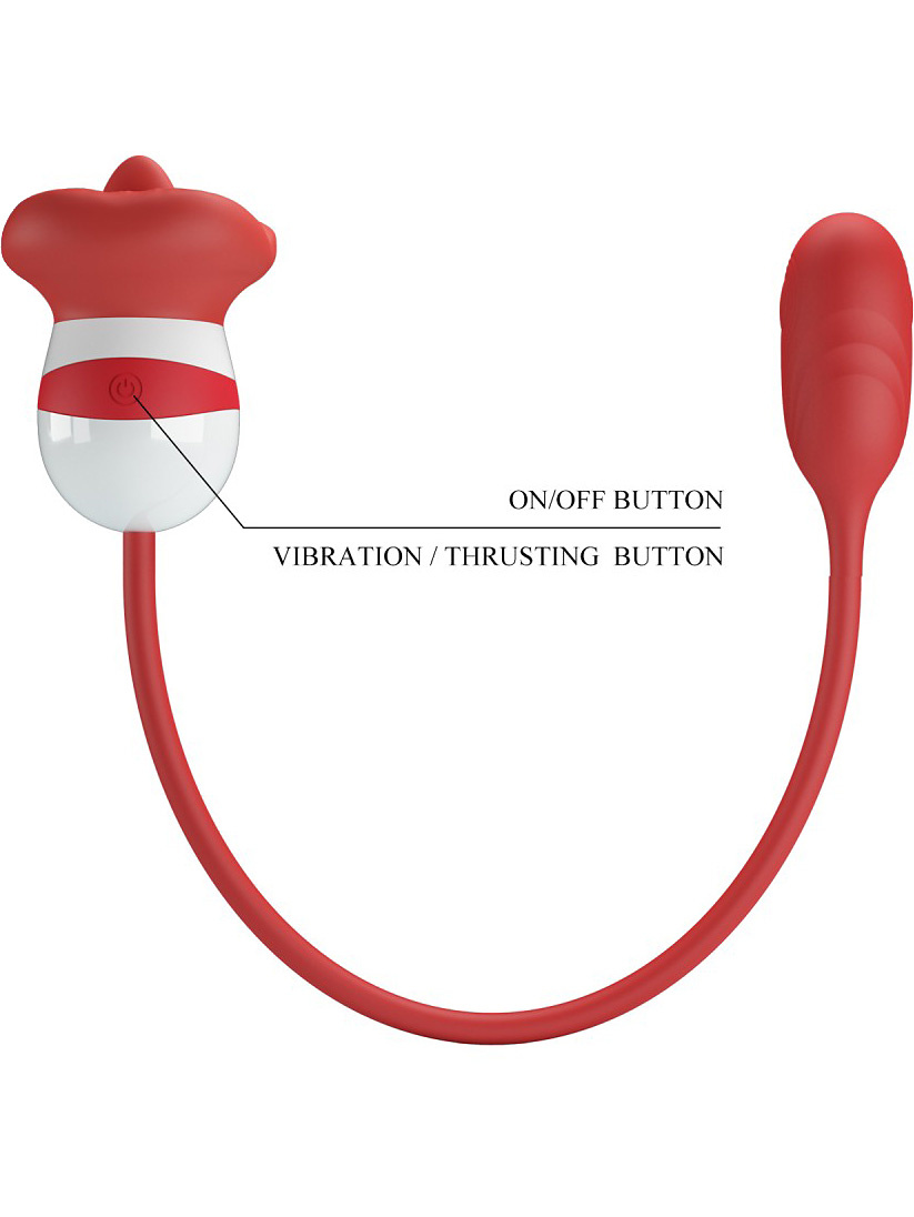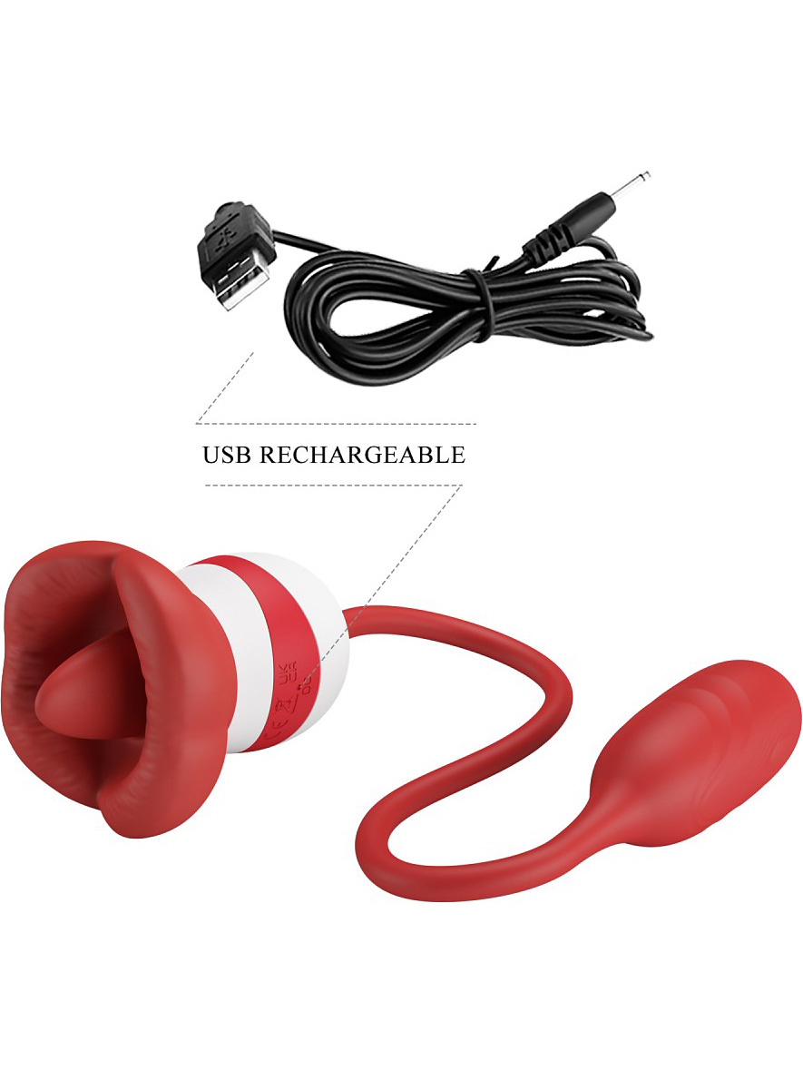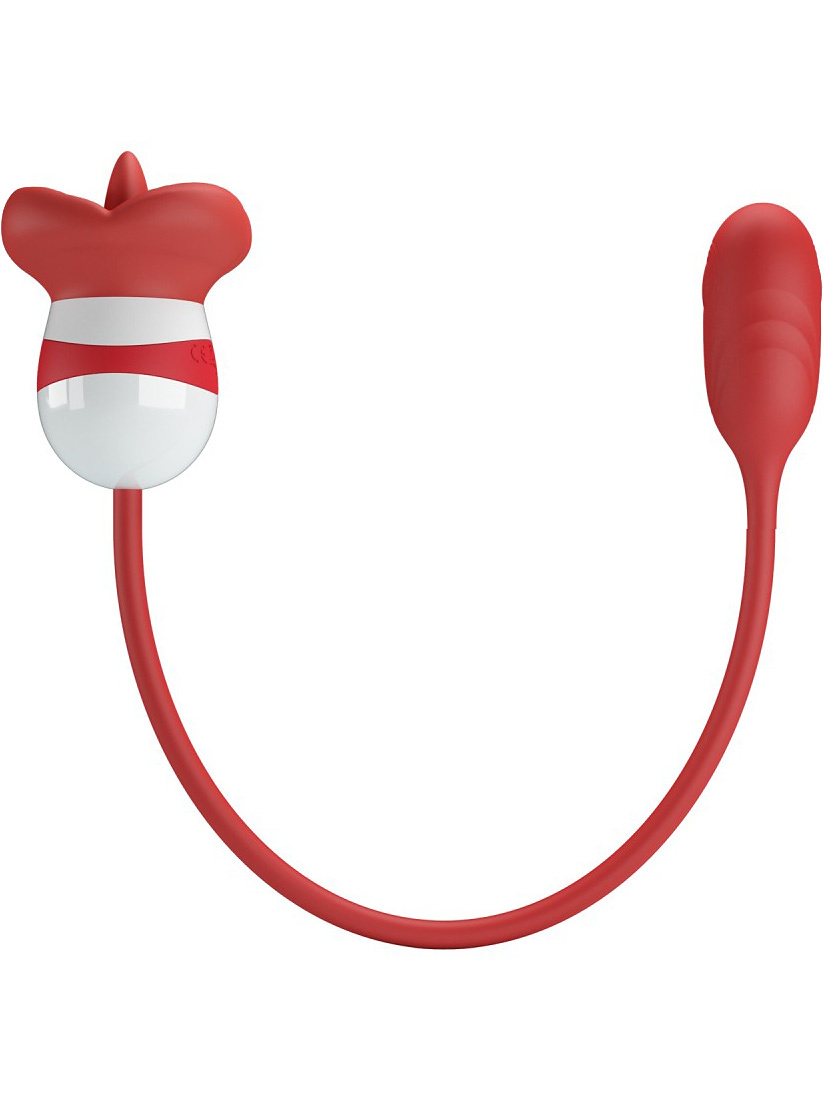 The rose-shaped design has a tongue and stimulates your clitoris with licking movements. On the other side of the flexible silicone strap you will find a vibrator that simultaneously stimulates your insides with a double-sided thumping function. You can also use it to stimulate your nipples. Each motor offers 5 delightful stimulation-modes.