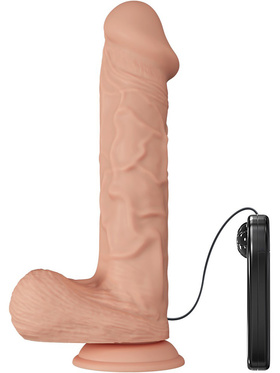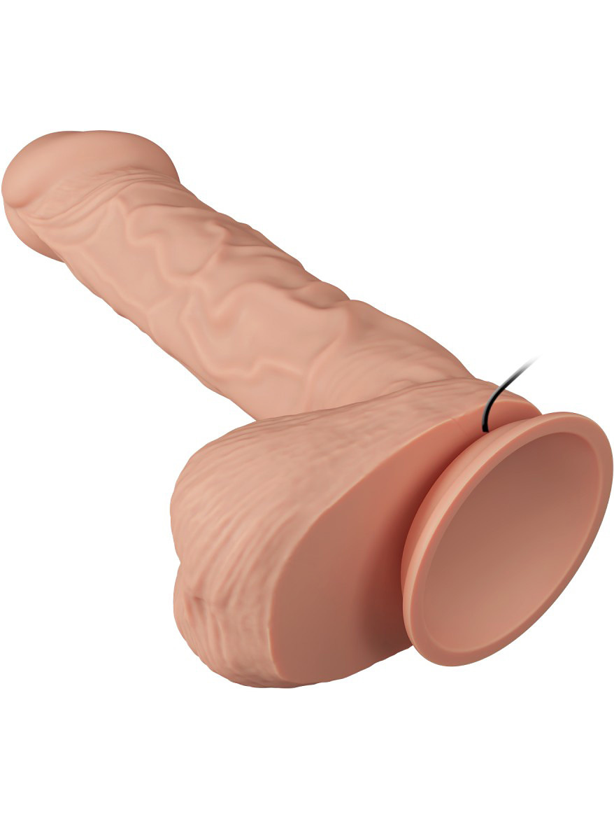 The Bergrisi Glide & Slide-Skin Vibrating Dildo is a large, realistic vibrating dildo with a loose, skin-like material that slides over the shaft for a realistic feel. The wired controller lets you easily control its multispeed-vibrations for extra stimulation. It also features realistic details such as a well-marked glans, pulsating veins and scrotum.