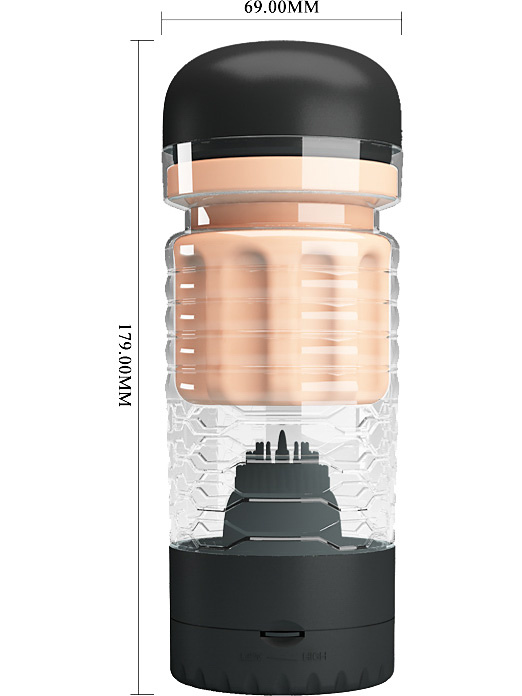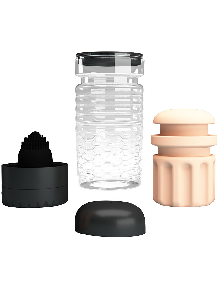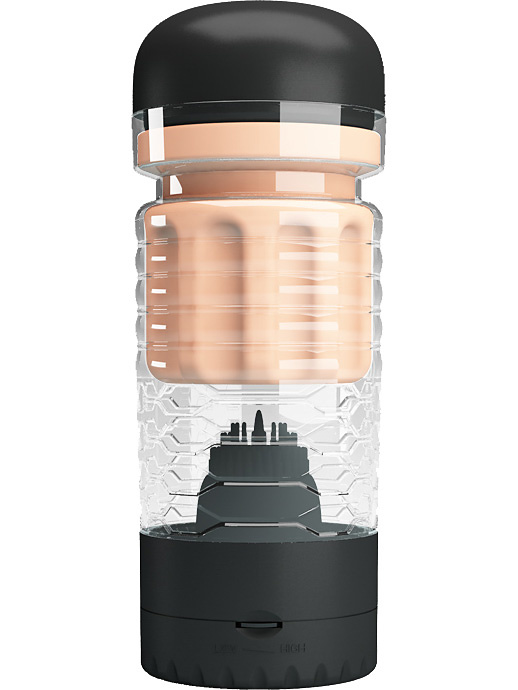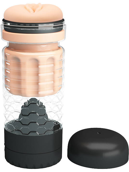 This is a battery-powered masturbator that is designed to give you extra pleasant masturbation-moments. The skin-colored sleeve has a vaginal opening and stimulating textures (knots and grooves) that embrace your penis. The sleeve is made of soft and elastic TPR that gives a realistic feel. For visual excitement, there's a transparent window that lets you see everything going on.
