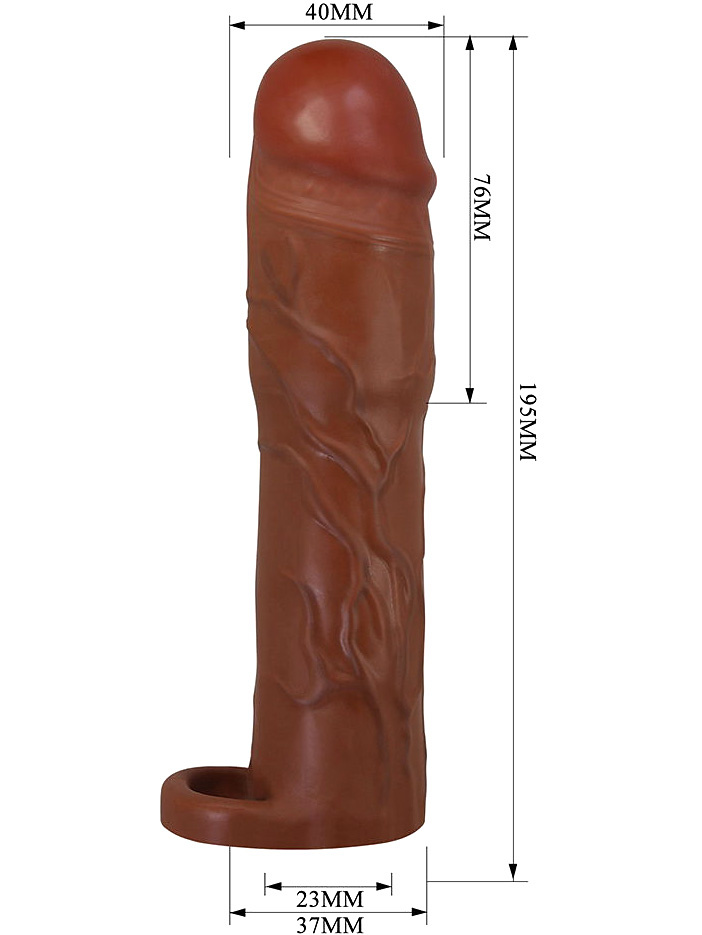 This is a realistic penis sleeve that makes you longer and up to 35% wider so you can fill your partner up properly. The lifelike TPR-material with a highlighted glans and pulsating veins is firm yet flexible to mimic the real thing.